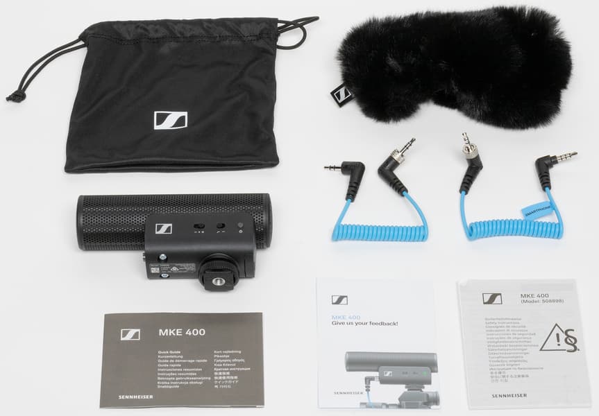 В комплект входят сам MKE 400, документация, ветрозащита, тканевый чехол, а также кабели для подключения.