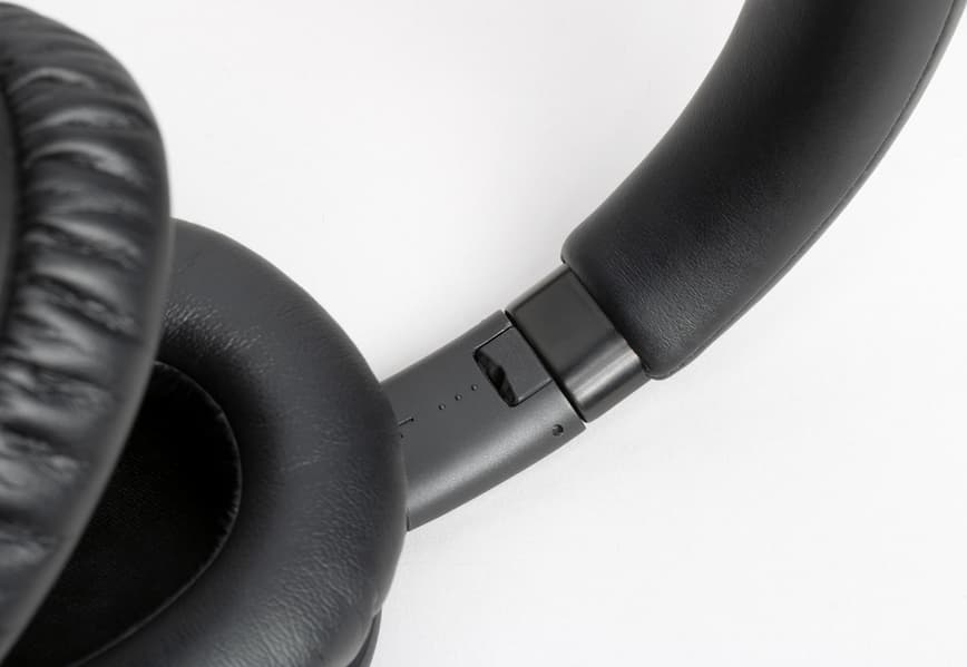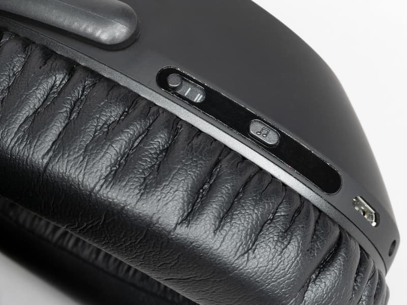 Все элементы управления наушниками сосредоточены на правой чашке. На передней ее части видно отверстие микрофона для голосовой связи, выше него находится выключатель Bluetooth, который может пригодиться для отключения наушников без разворота чашек, например. Сразу отметим, что при подключении кабеля к соответствующему разъему беспроводное соединение деактивируется автоматически.