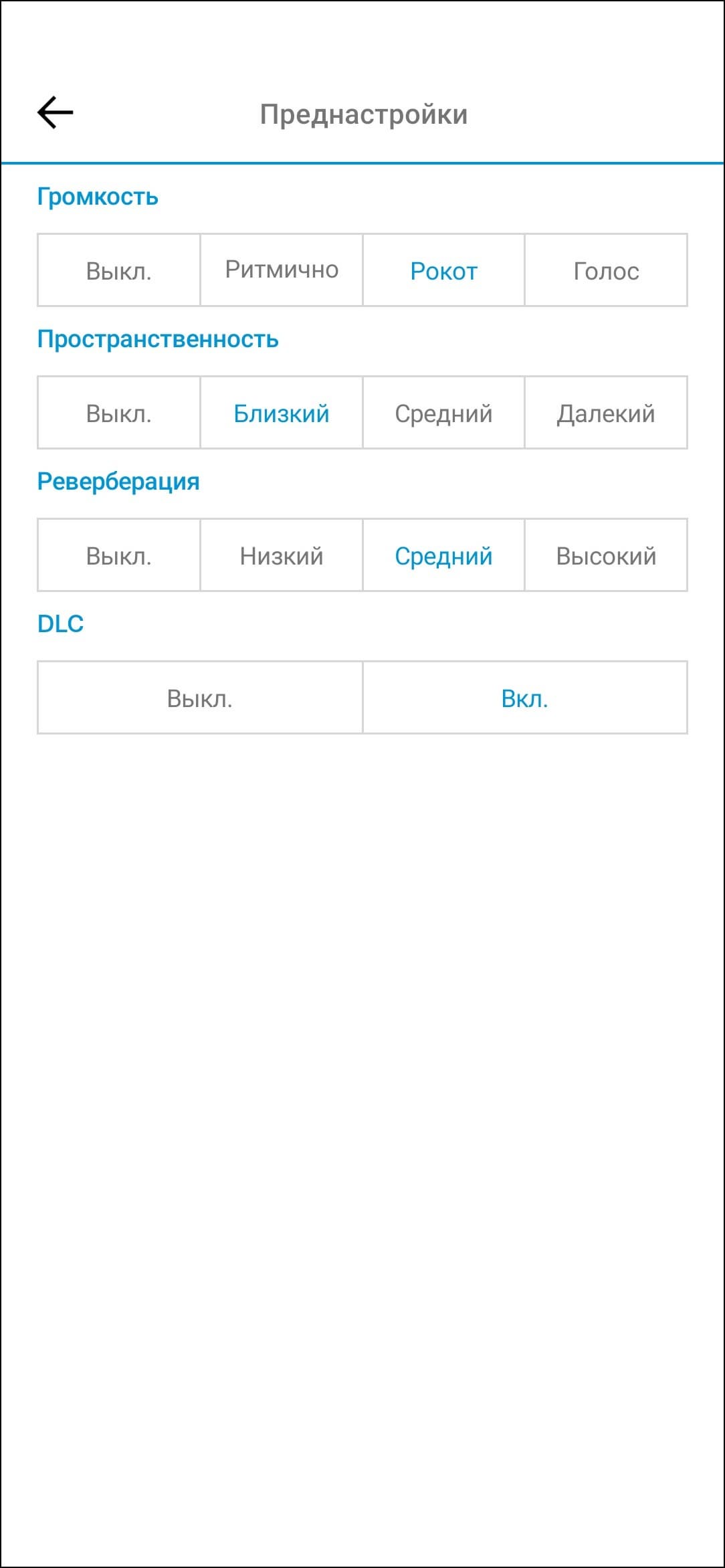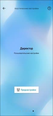 Ну и, наконец, последняя серия настроек касается особенностей звучания. С эквалайзерами у Sennheiser все всегда довольно оригинально, вспомнить хотя бы уже знакомый нам вариант, управляемый перемещением одной точки по экрану. На этот раз нет даже точки, лишь несколько пресетов, управляющих не только эквалайзером, но и встроенным эффектами реверберации: нейтральный, клуб, кино и речь. Плюс можно настраивать ряд параметров вручную, но по сути в соответствующем меню происходит все тот же выбор серии преднастроек.