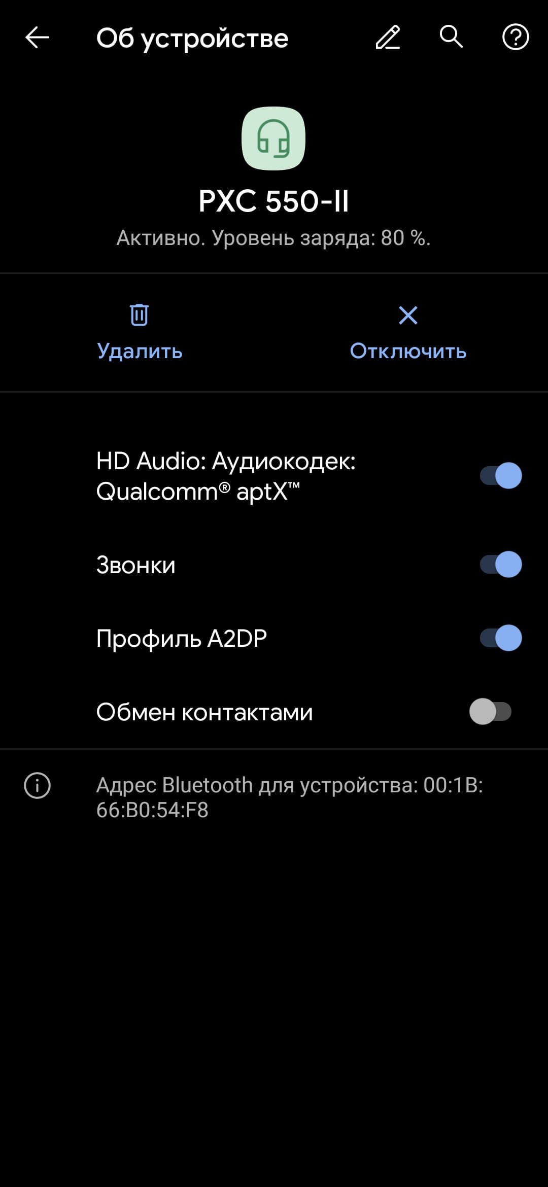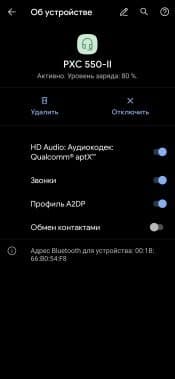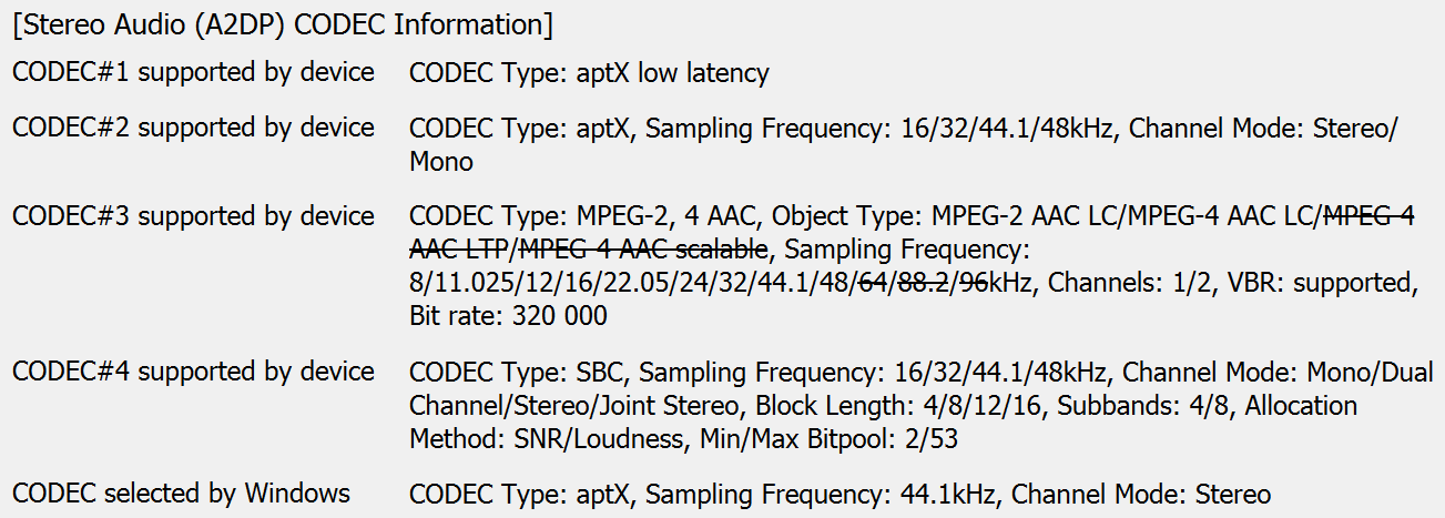 Мультипойнт гарнитура поддерживает, но перемещение фокуса между двумя устройствами работает не всегда корректно — приходится принудительно нажимать кнопку stop в плеере, либо обновлять страницу браузера, если воспроизведение идет из него. Но тут, вероятно, дело не только и не столько в наушниках, сколько в особенностях используемого ПО. Отдельно с Windows 10, кстати, PXC 550-II работает прекрасно. С помощью утилиты Bluetooth Tweaker мы традиционно получили полный список поддерживаемых кодеков и их режимов.