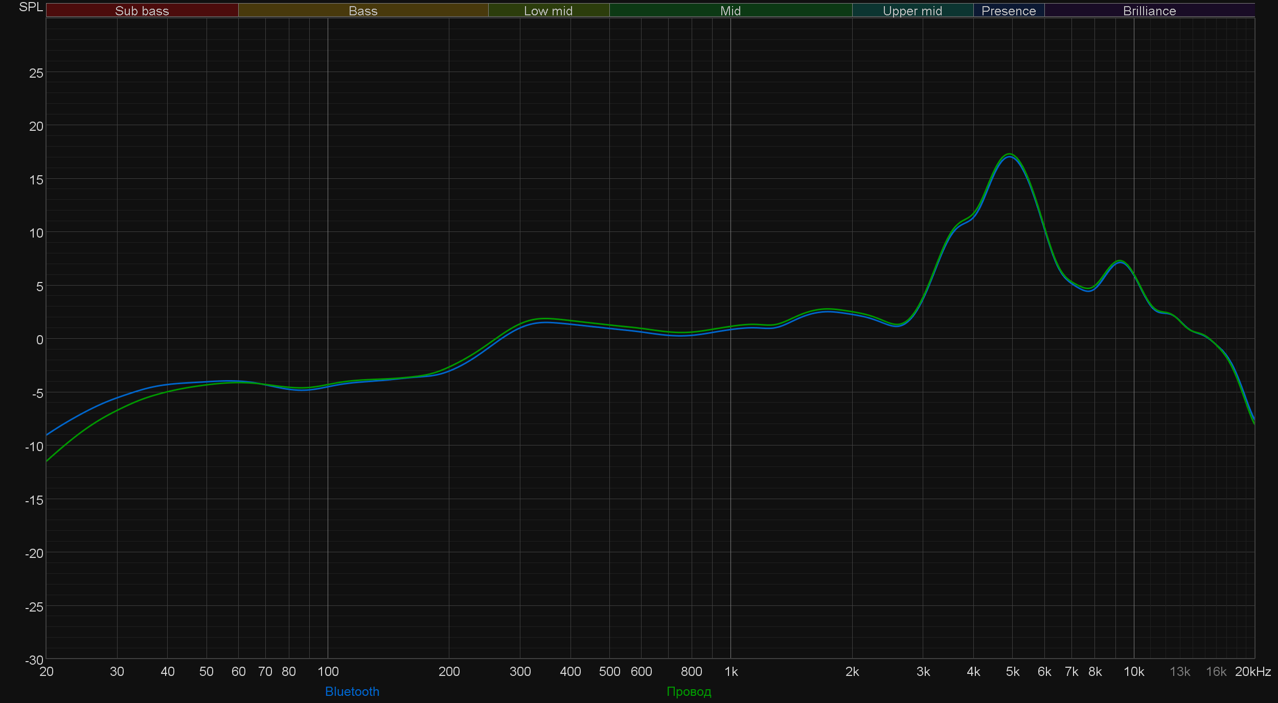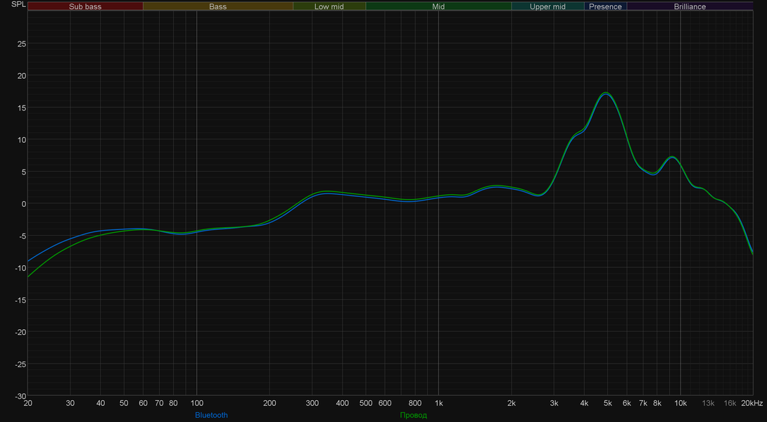 На графике хорошо видно, что НЧ-диапазон чуть-чуть «провален», нижняя середина и непосредственно средние частоты немного подчеркнуты, но при этом сами по себе довольно «ровные». В целом звучит это все очень приятно и интересно. Переход на проводное подключение практически ничего не меняет — тональный баланс остается прежним.