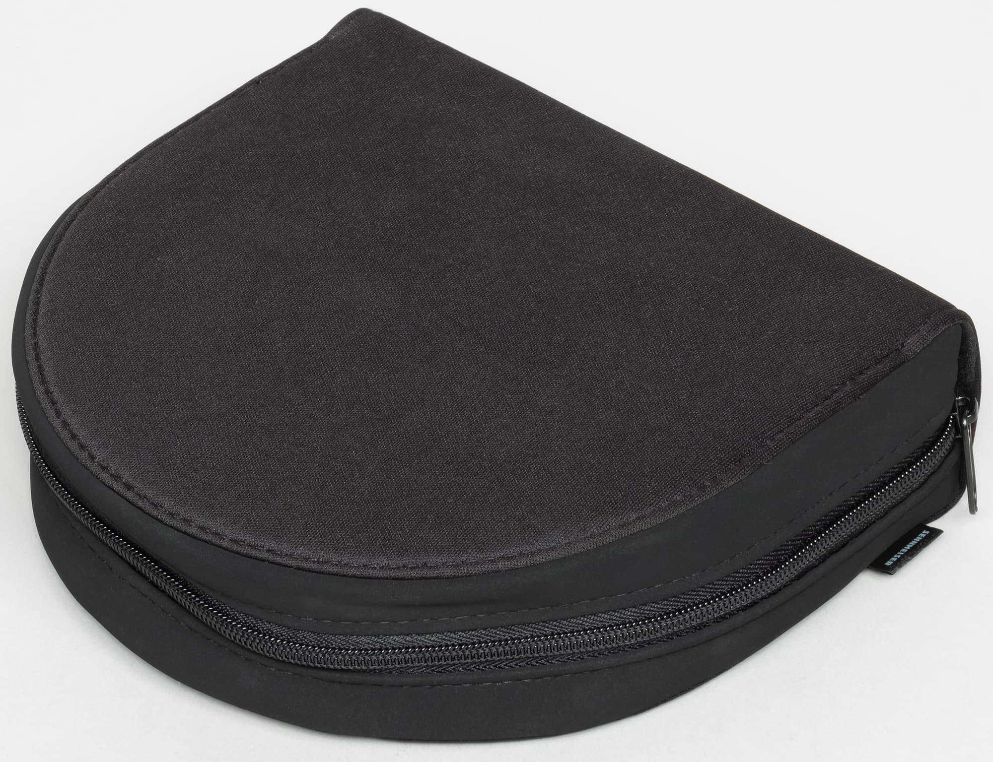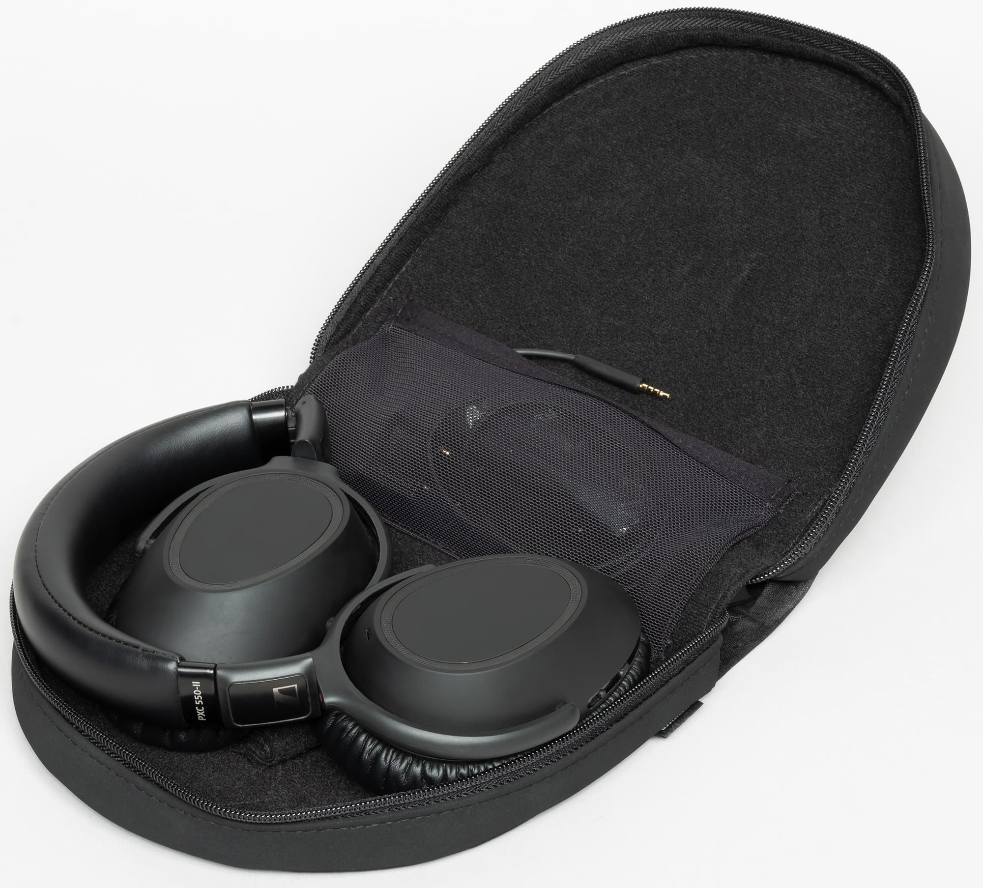 Кейс плотный и хорошо защищает устройство от различных воздействий, сверху обтянут приятной на ощупь тканью, довольно устойчивой к загрязнениям. Внутрь помещаются как сами наушники в сложенном состоянии, так и комплектные кабели. Сшито все очень добротно, застежка-молния работает замечательно.