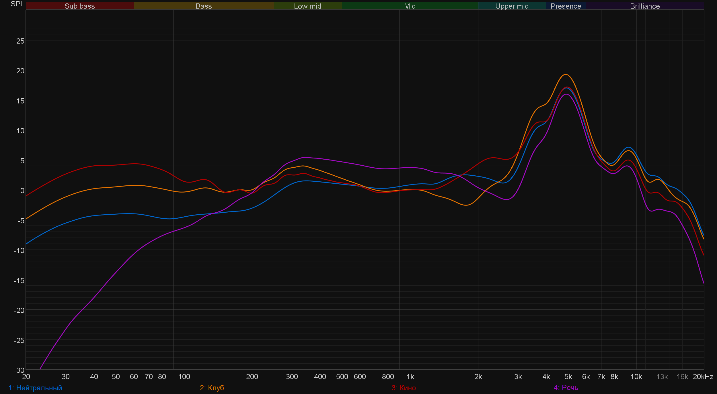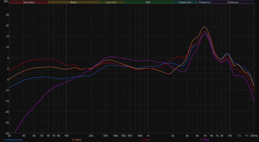 График выше получен при использовании «нейтрального» пресета на соответствующей вкладке в приложении Smart Control. Посмотрим, как ведет себя гарнитура при выборе разных комплектов предустановок.