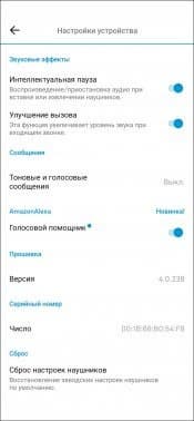 На главном экране мы видим изображение самих наушников, информацию об уровне заряда их аккумулятора и несколько вкладок с настройками. Начнем с меню, открывающегося по клику на значок шестеренки в правом верхнем углу. В нем можно включить и выключить «умную паузу» при снятии наушников, а также ту самую функцию улучшения звука при звонке, о которой мы говорили чуть выше. Там же доступны информация о версии прошивки, серийный номер и так далее.