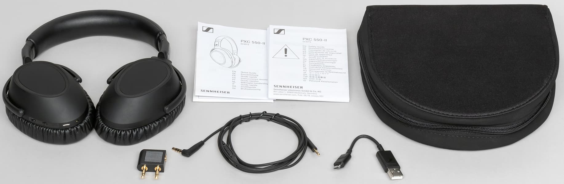 В комплект входят сами наушники, зарядный кабель USB—Micro-USB, аудиокабель с микрофоном для проводного подключения к источнику, адаптер для самолета, чехол и документация.