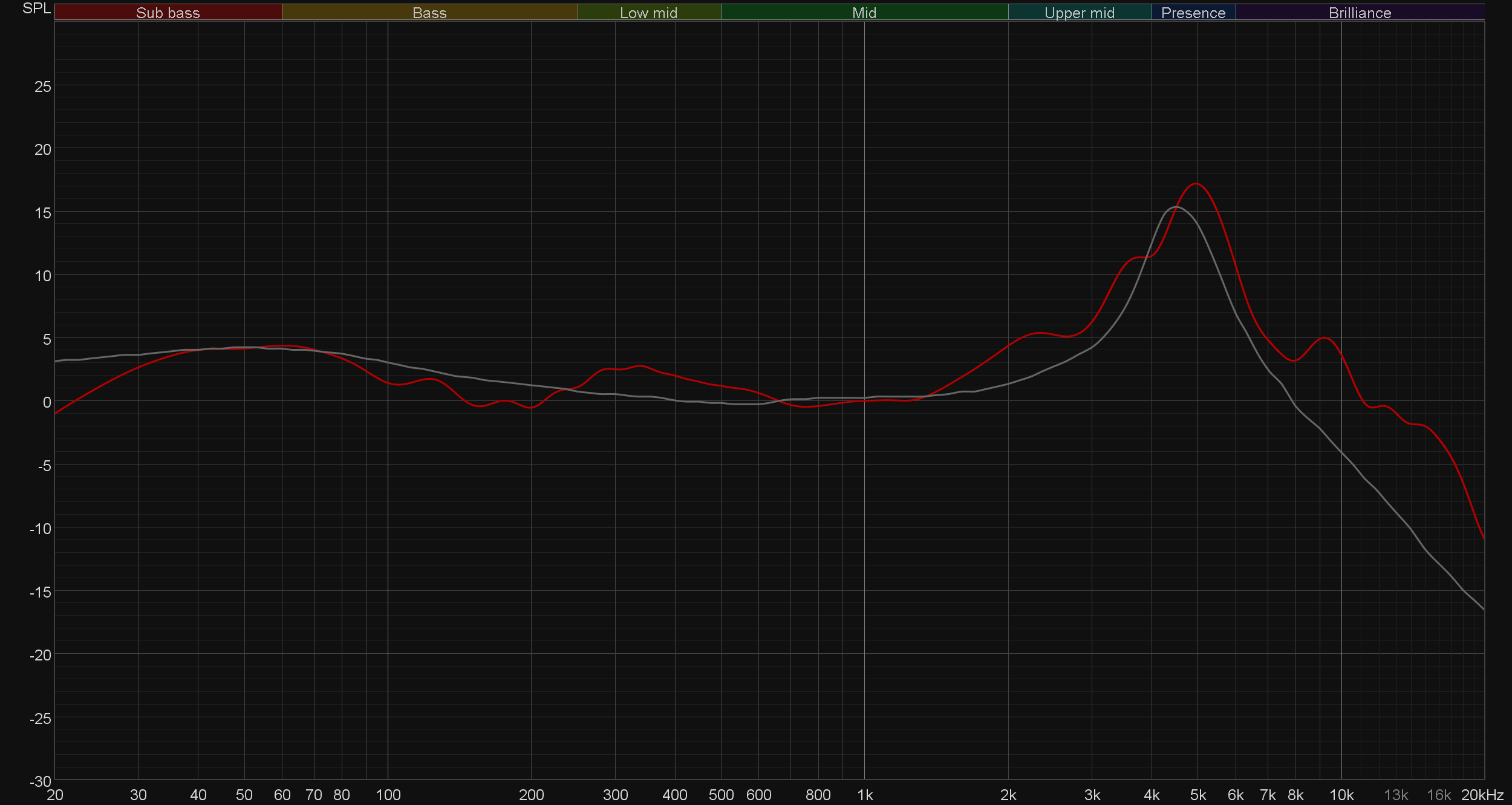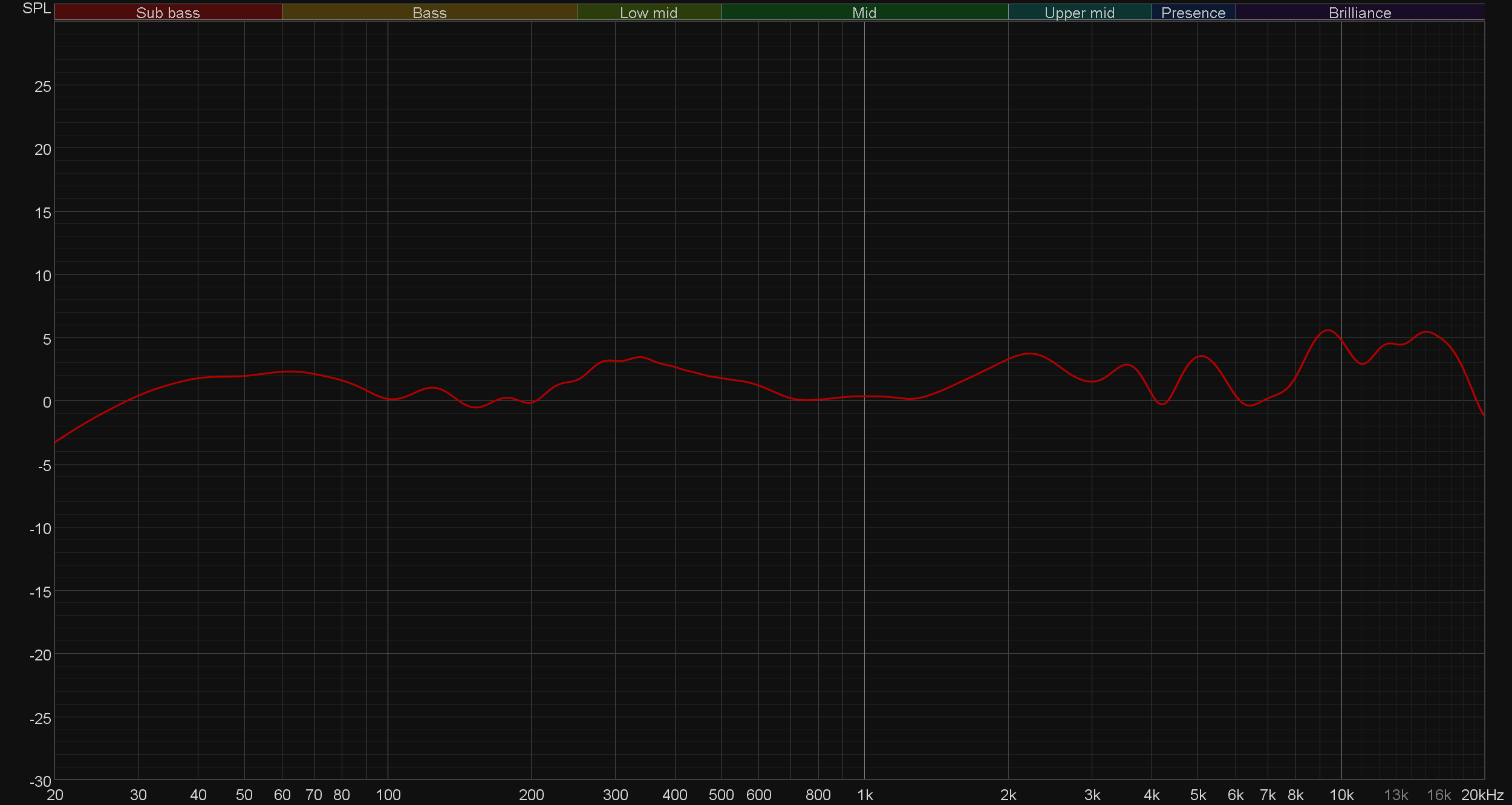 График АЧХ показан на фоне целевой кривой, предоставленной производителем используемого стенда. Она является адаптированным под конкретное устройство аналогом так называемой «кривой Хармана», созданной командой Harman International под руководством доктора Шона Олива. Люди неодинаково воспринимают звук разной частоты, поэтому даже самые точные измерения могут не соответствовать реальному пользовательскому опыту. Для компенсации этих различий и используется целевая АЧХ. Близкое к ней звучание оценивалось сотнями участников экспериментов как нейтральное, сбалансированное, естественное и так далее.