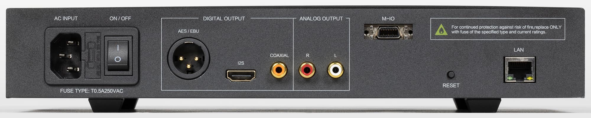 Основная часть портов для подключения плеера размещена на задней панели. Слева мы видим разъем для подключения питания и клавишу включения/выключения. Далее находится блок с цифровыми выходами: разъемом XLR для подключения посредством AES/EBU, а также использующий I2S порт HDMI. Ну и, наконец, третий вариант цифрового подключения — коаксиальный выход S/PDIF.