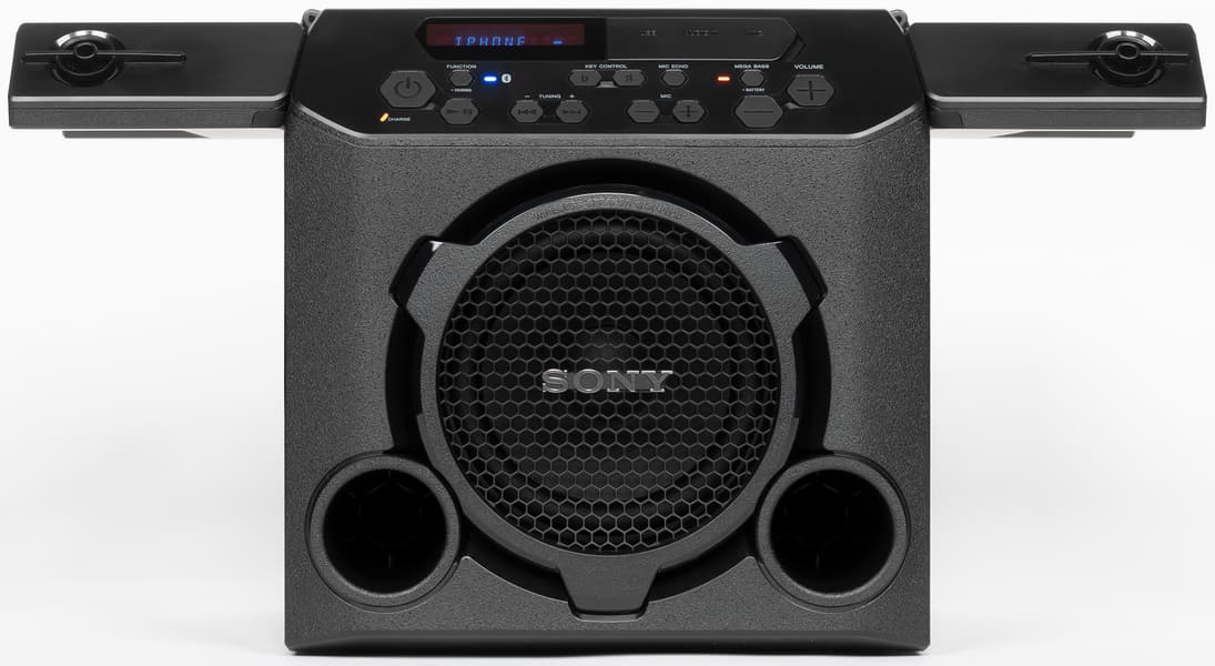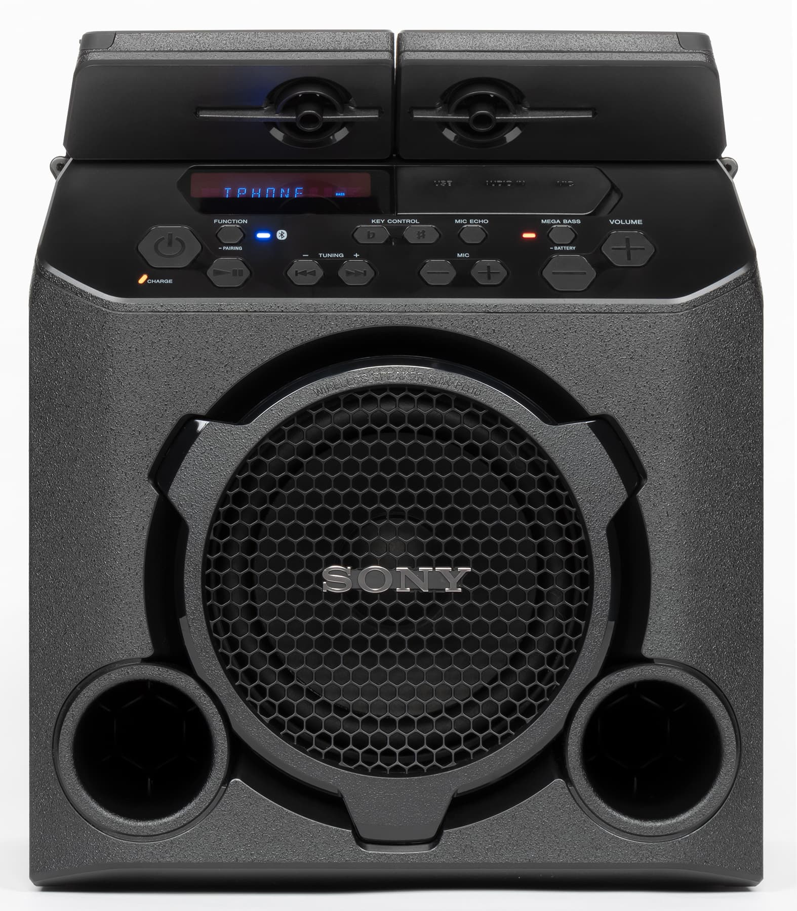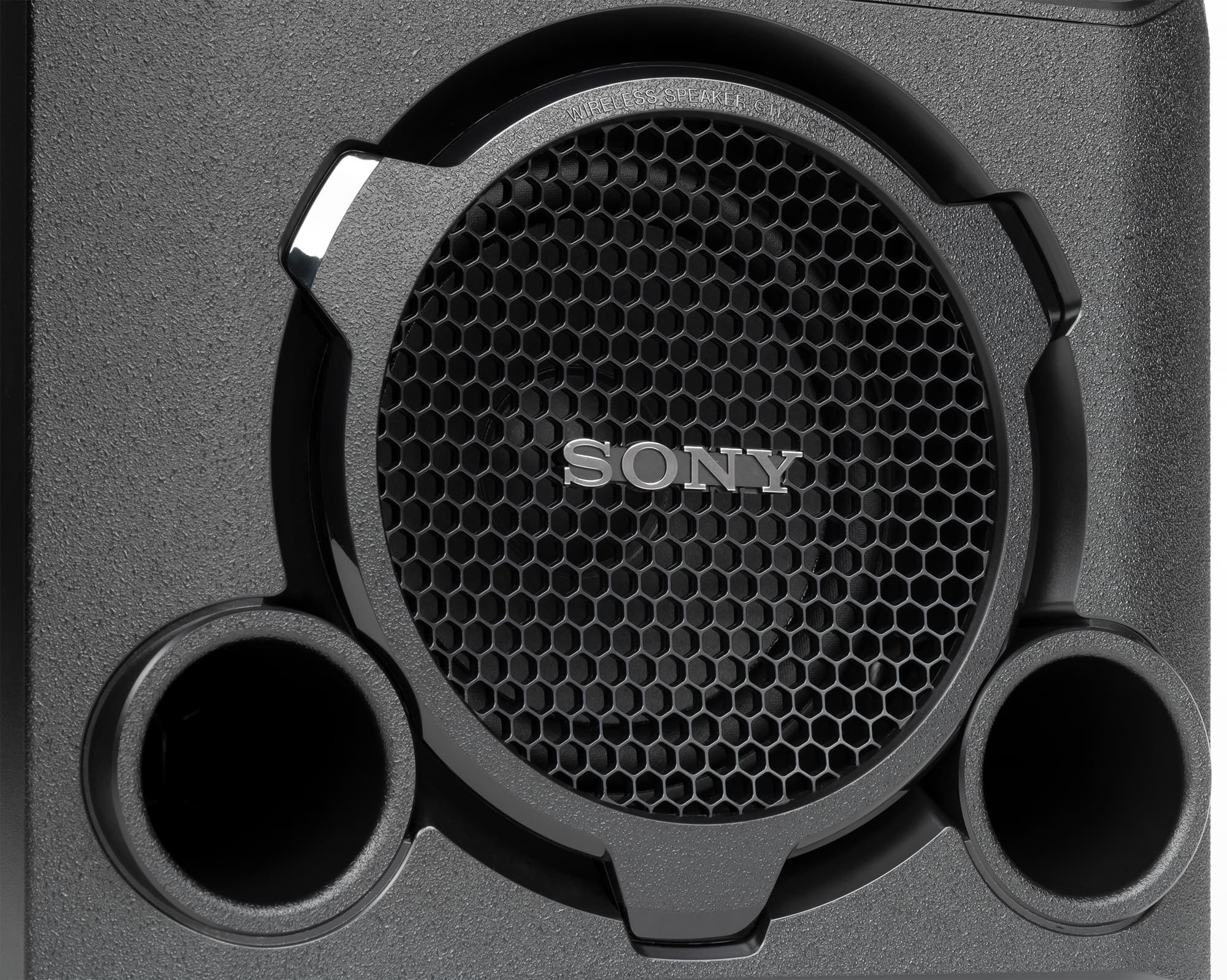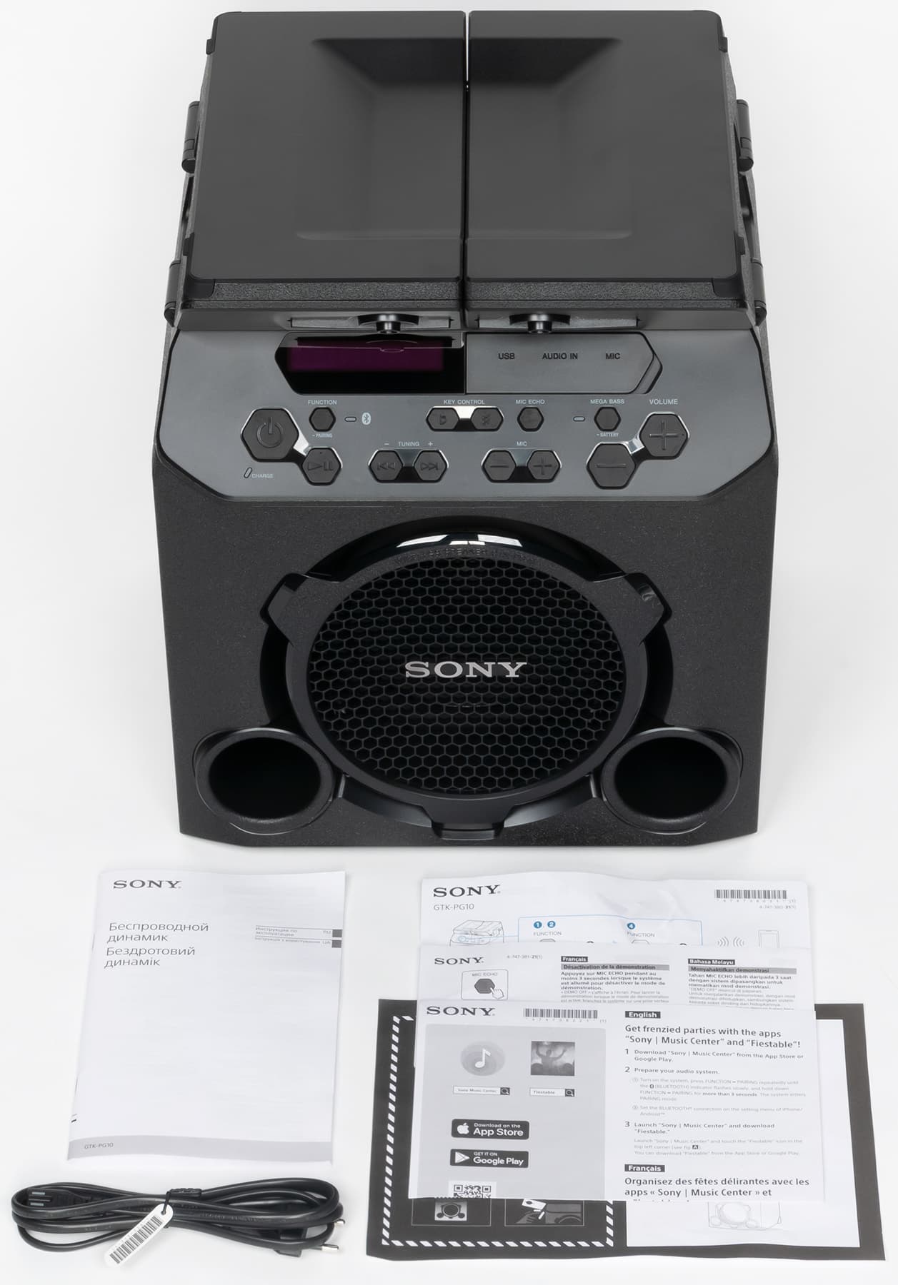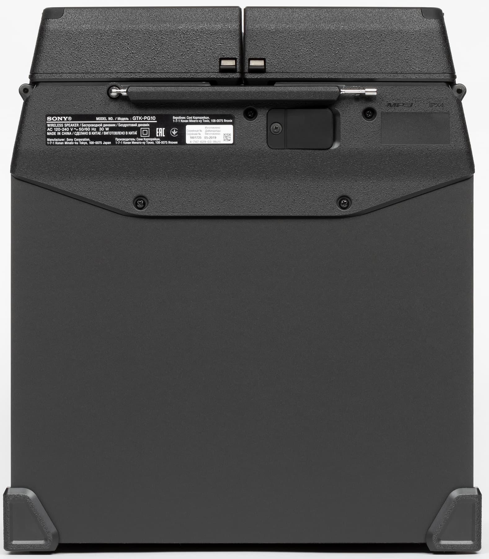 На передней панели Sony GTK-PG10 находится низкочастотный динамик диаметром 18 см, закрытый металлической защитной сеткой с логотипом. По бокам от него расположены два отверстия фазоинверторов.