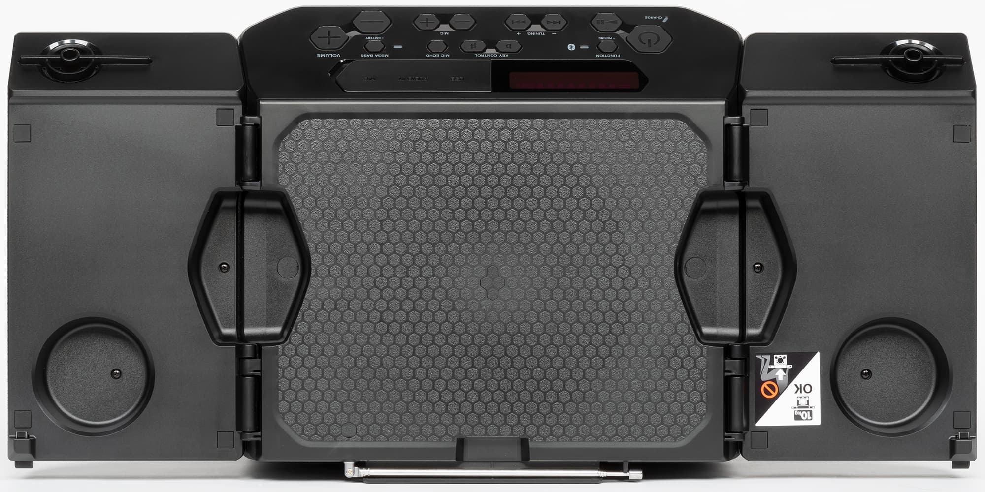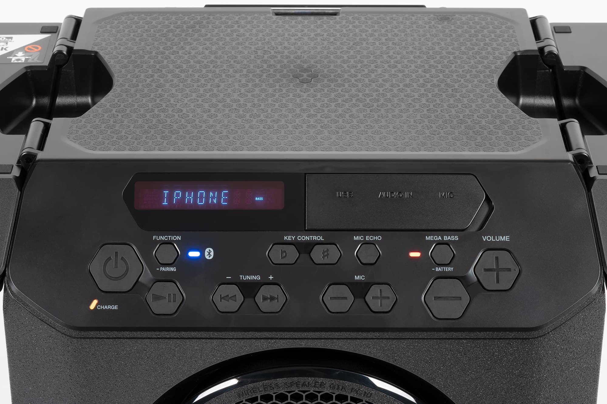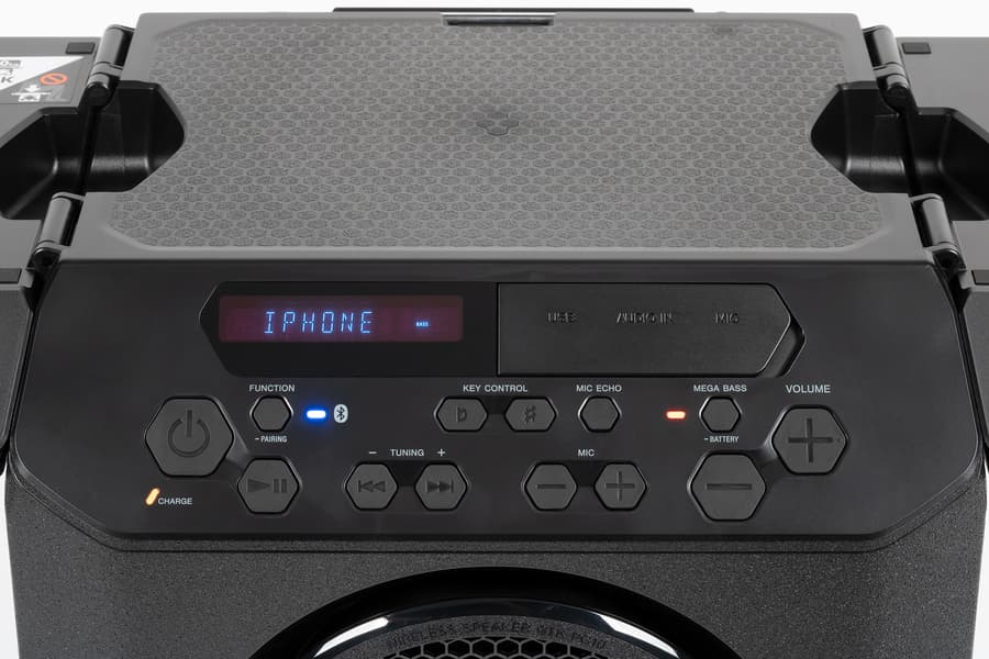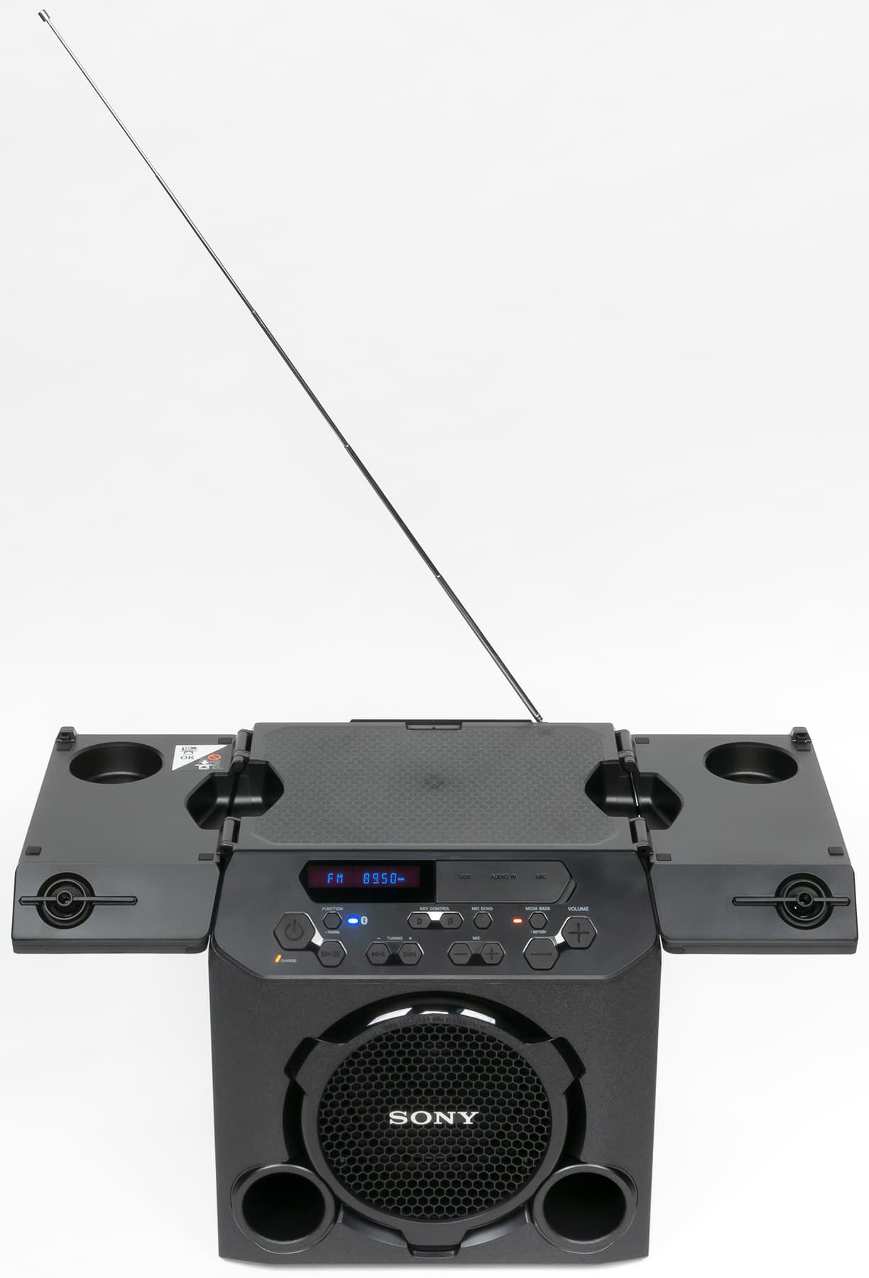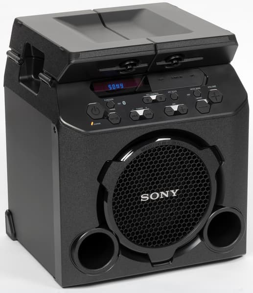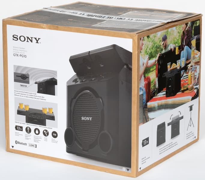 На передней панели Sony GTK-PG10 находится низкочастотный динамик диаметром 18 см, закрытый металлической защитной сеткой с логотипом. По бокам от него расположены два отверстия фазоинверторов.