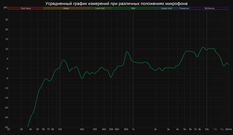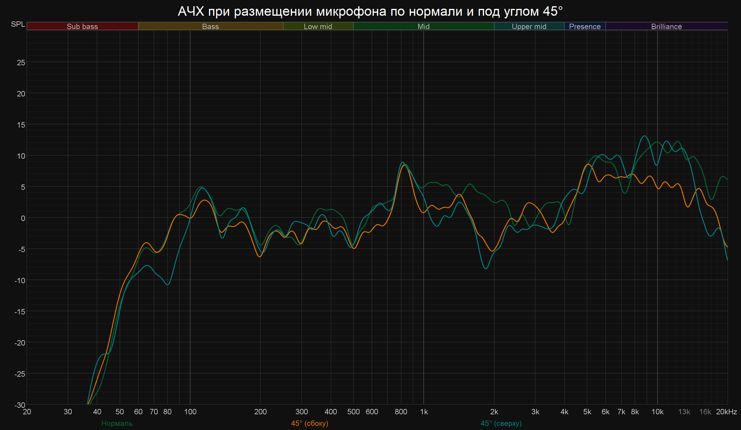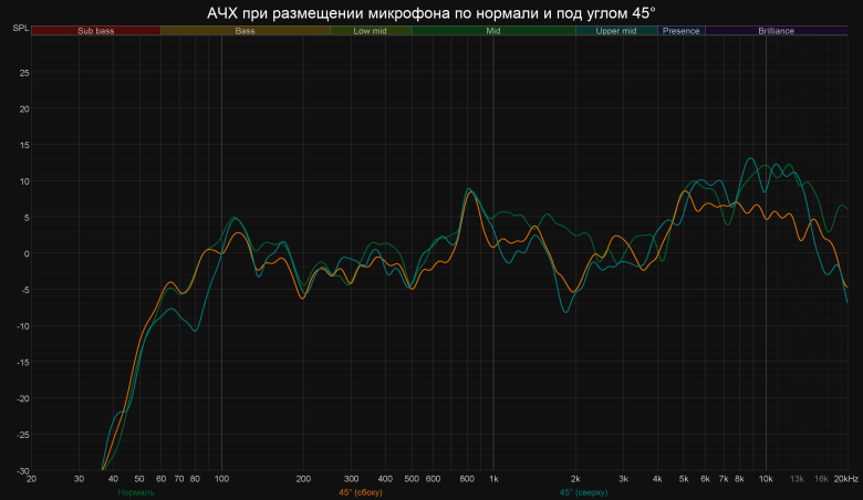 Ну и под конец мы в очередной раз вспомнили, что портативные решения мало кто слушает, размещая их прямо перед собой. Плюс зачастую колонка находится где-нибудь на уровне пояса. Потому были проведены еще два измерения — под углом 45° сверху и сбоку. Принципиально АЧХ не изменилась, но некоторые нюансы все-таки появились. На последнем графике мы усреднили все измерения, получив максимально приближенный к реальному опыту прослушивания результат. Звучание, надо сказать, довольно специфичное. Но значительная часть нюансов может нивелироваться эквалайзером в Sony Music Center или используемом плеере.