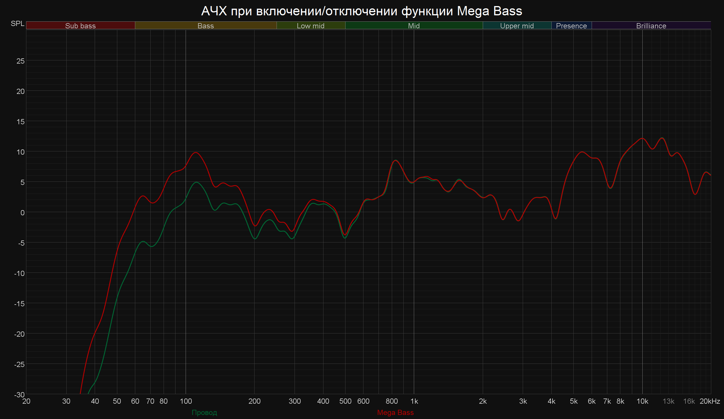 При подключении посредством Bluetooth в звучании появляются неприятные акценты на середине, при этом ее детальность основательно падает — изменения хорошо заметны на втором графике. Но здесь важно отметить, что получен он был при использовании кодека SBC — для измерений применялся ПК под управлением Windows, которая почему-то предпочла именно его. Добавить акцент на НЧ-диапазоне можно с помощью активации функции Mega Bass — «добавка» получается вполне очевидной, но при этом не чрезмерной.