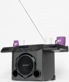 Заявленное время работы от аккумулятора — до 13 часов на средней громкости и до 5 часов на максимальной. В ходе тестирования система проработала 14 часов на громкости чуть ниже средней — использовать ее на больших значениях внутри помещения очень некомфортно для слушателя и негуманно по отношению к соседям. Радиоприемник более-менее уверенно принимает сигнал даже в самом дальнем углу комнаты, на свежем воздухе и с приведенной в «боевое состояние» антенной все должно быть совсем замечательно.
