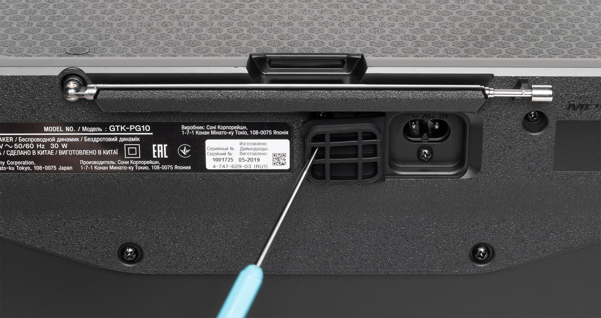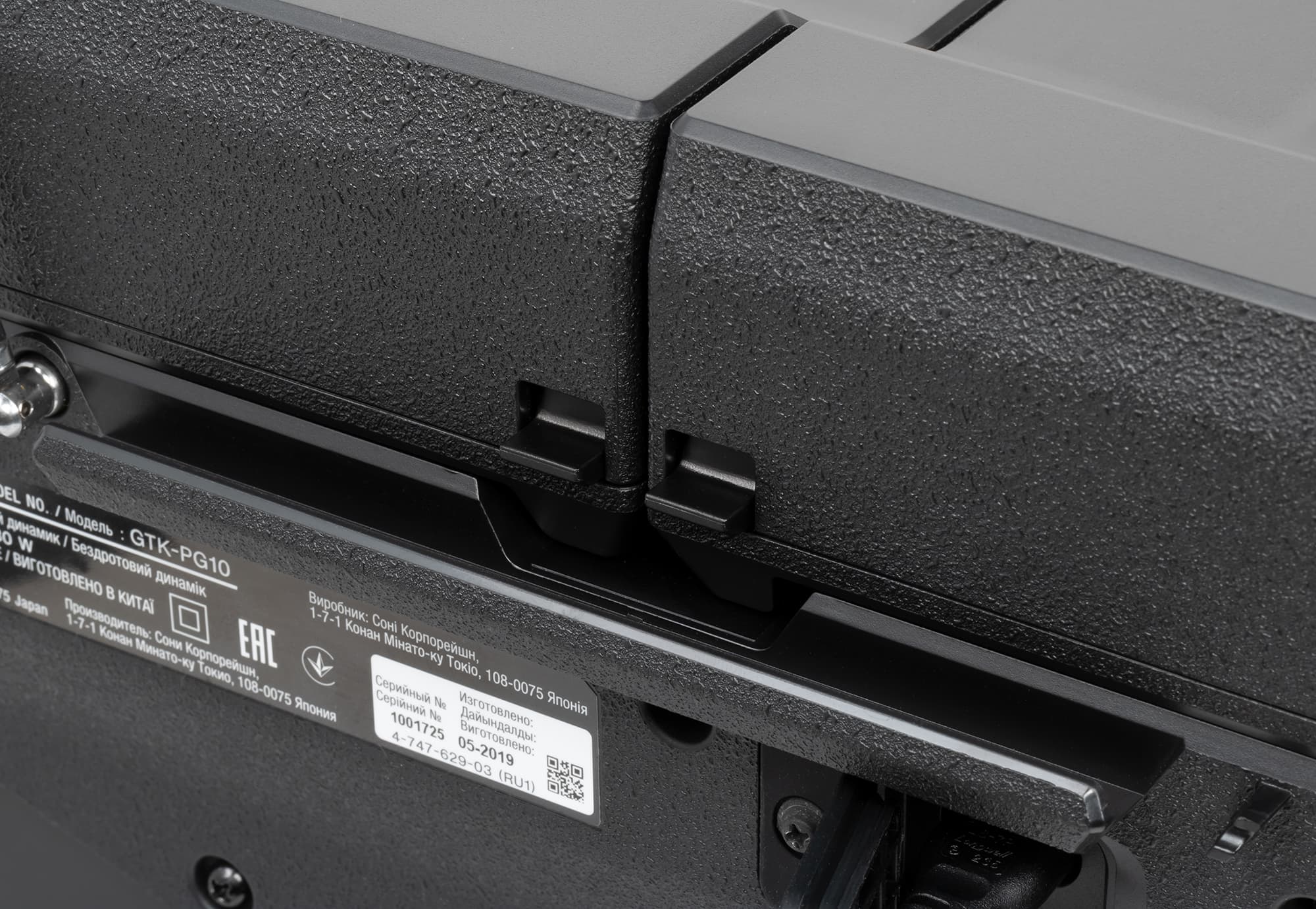 На дне корпуса находятся довольно высокие и устойчивые резиновые ножки, а также отверстие для установки устройства на стойку. Диаметр отверстия стандартный — 35 мм, можно использовать стойки, применяемые для размещения концертной акустики. Эта опция заставляет задуматься о том, что потенциальными пользователями Sony GTK-PG10 могут быть не только любители вечеринок на свежем воздухе, но и некоторые профессиональные организаторы мероприятий, ищущие портативное устройство для работы.