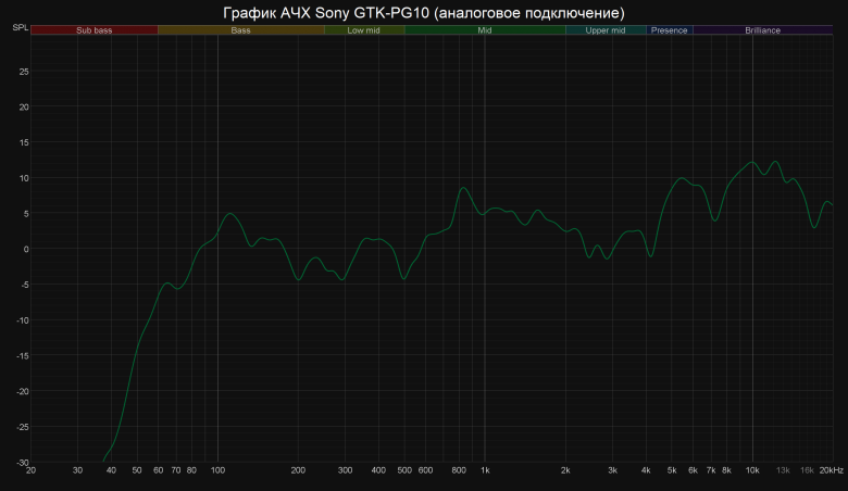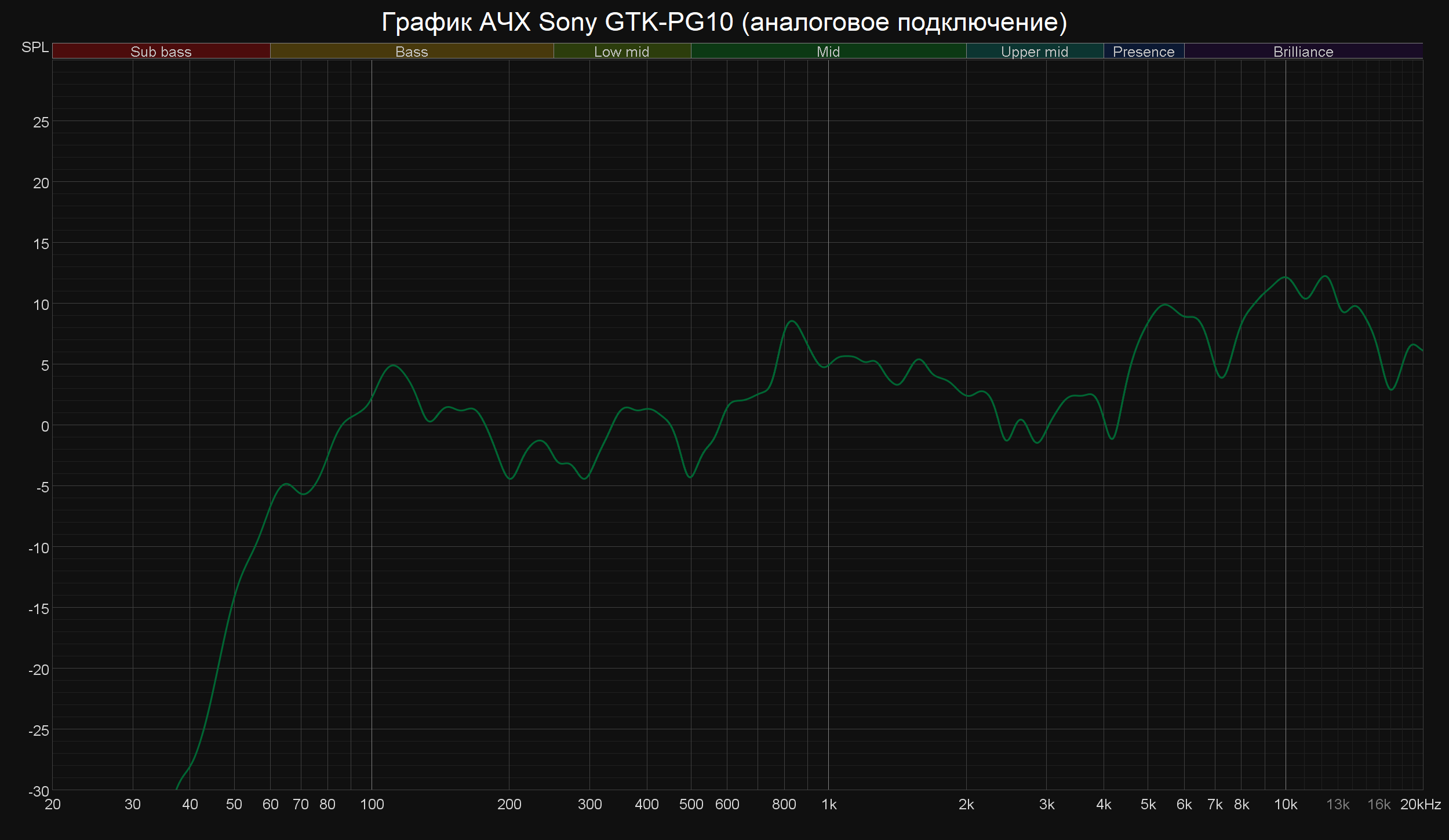 Запас громкости у колонки весьма солидный, что неудивительно с учетом ее предназначения. На максимальных ее значениях возможно появление небольших искажений в низкочастотном диапазоне, но заметны они только в некоторых композициях с «форсированным» басом. Так называемого «глубокого баса» колонка воспроизводить даже не пытается, что правильно и хорошо — в противном случае наверняка бы возникли неприятности с воспроизведением среднечастотного диапазона, так как ответственный за НЧ и СЧ динамик всего один. Твиттеры хорошо отрабатывают верхние частоты, в отличие от многих портативных систем у Sony GTK-PG10 они присутствуют и весьма явственно выражены.