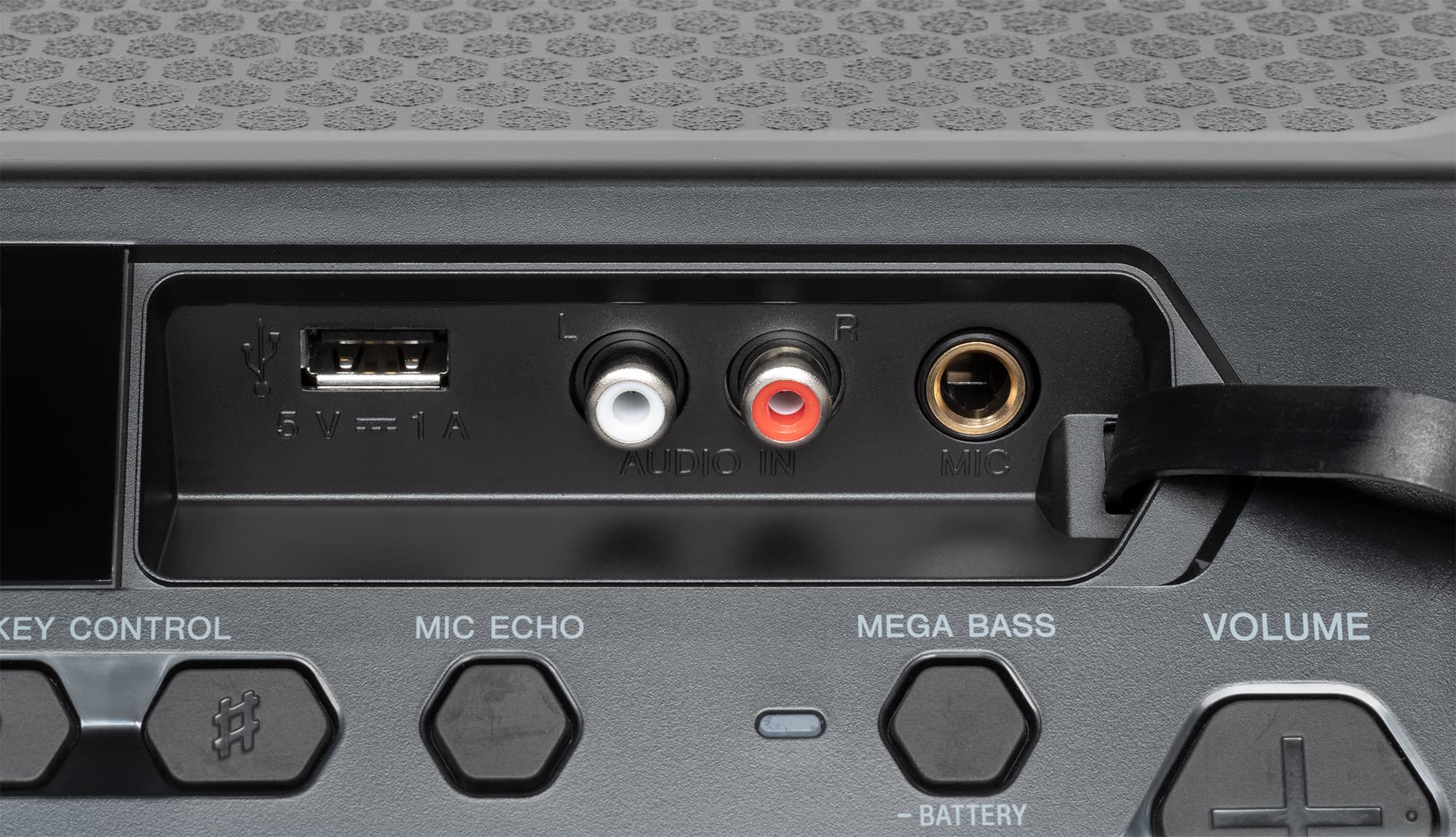 Помимо уже упомянутой клавиши Function на панели расположены три индикатора, а также кнопки питания, управления воспроизведением, перелистывания треков/пресетов радиостанций, громкости самой колонки и микрофона, изменения тональности играющего трека, включения эффекта эхо и режима Mega Bass. Нажимаются кнопки тяжеловато и с несколько невнятным кликом — серьезного дискомфорта это не доставляет, но чуть привыкнуть придется.