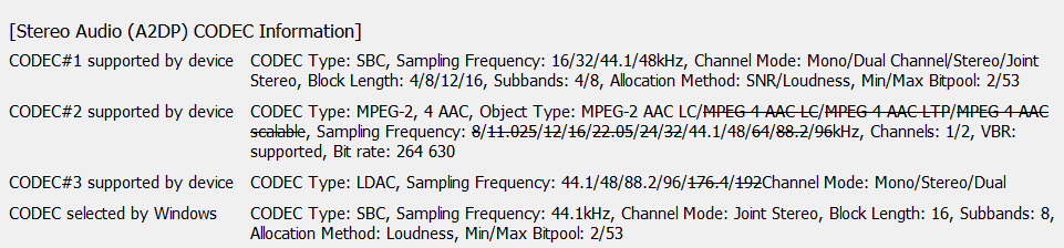 Sony GTK-PG10 поддерживает одновременное беспроводное подключение нескольких устройств, что было проверено параллельным соединением к ПК под управлением Windows 10. Заодно с помощью утилиты Bluetooth Tweaker был получен полный список встроенных кодеков и их режимов. Помимо LDAC и AAC система поддерживает также базовый SBC, который и был выбран Windows для работы.
