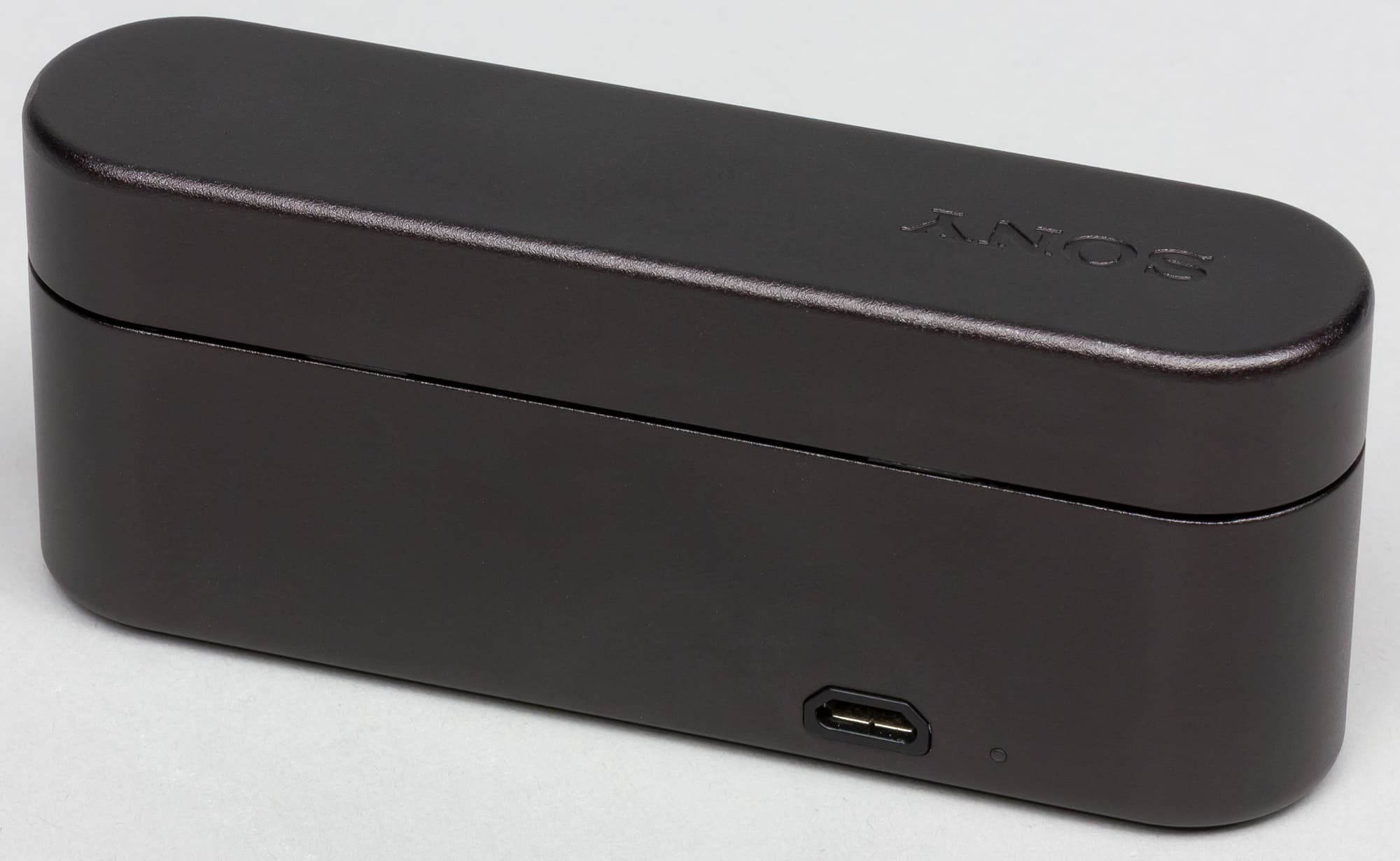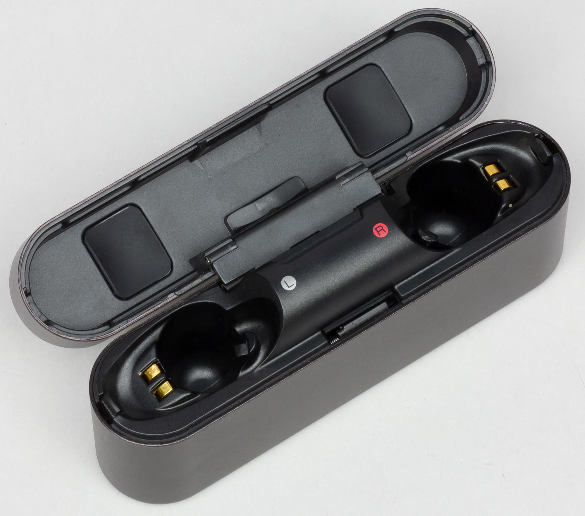 Для открытия крышки требуется хорошо дозированное усилие: бокс достаточно легко открыть, однако случайные раскрытия в кармане исключены. Внутри располагаются два формованных отверстия с контактными площадками и маркировкой, указывающей, для какого наушника предназначено конкретное отверстие. На крышке расположены вставки для более плотного удержания наушников внутри бокса.