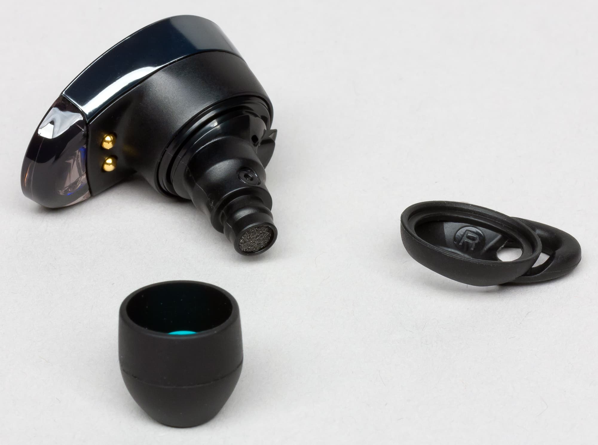 После снятия амбушюр и петель обнаруживается достаточно длинная ножка канала со вставкой, защищающей канал от проникновения инородных тел. На внутренней части петель находится маркировка полярности.
