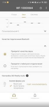 Ну и, наконец, посмотрим на уже упомянутую возможность переключаться между режимами приоритета качества звука или стабильности подключения — тут все просто и понятно. В самом крайнем случае можно также переключиться на кодек SBC из меню настроек гаджета, но нам за все время использования наушников делать этого не приходилось ни разу.