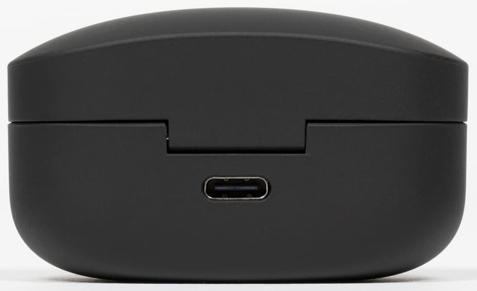 На задней стенке расположен порт USB Type C для зарядки, выше видна петля, обеспечивающая открытие крышки. У нее есть довольно ощутимый люфт, который вряд ли может повлиять на надежность конструкции и удобство ее использования. В целом и футляр, и сами наушники собраны хорошо — вполне на уровне, который ожидаешь от дорогого брендового устройства.