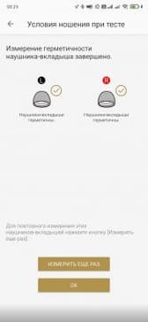 Ниже мы видим очень полезную опцию — определение правильности ношения и подбора насадок. Надеваем наушники, активируем функцию — гарнитура издает пару вполне приятных звуков и с помощью встроенных микрофонов определяет, все ли хорошо. Результаты ниже, кстати, мы получили, разместив наушники на нашем стенде для измерений — как видно, они ему идеально подошли.