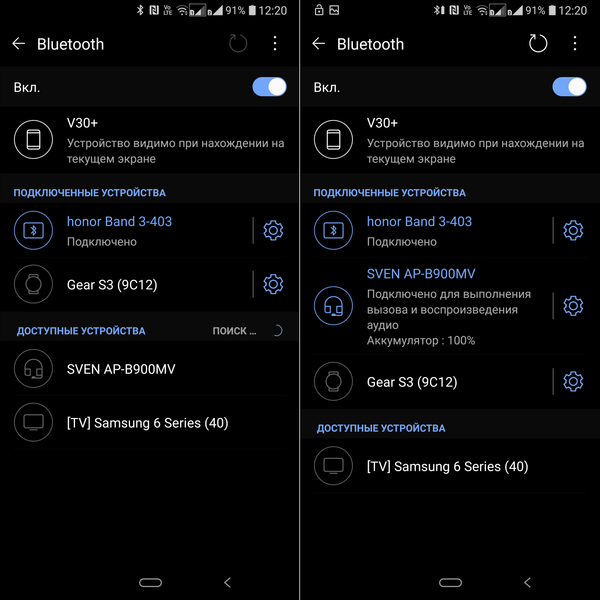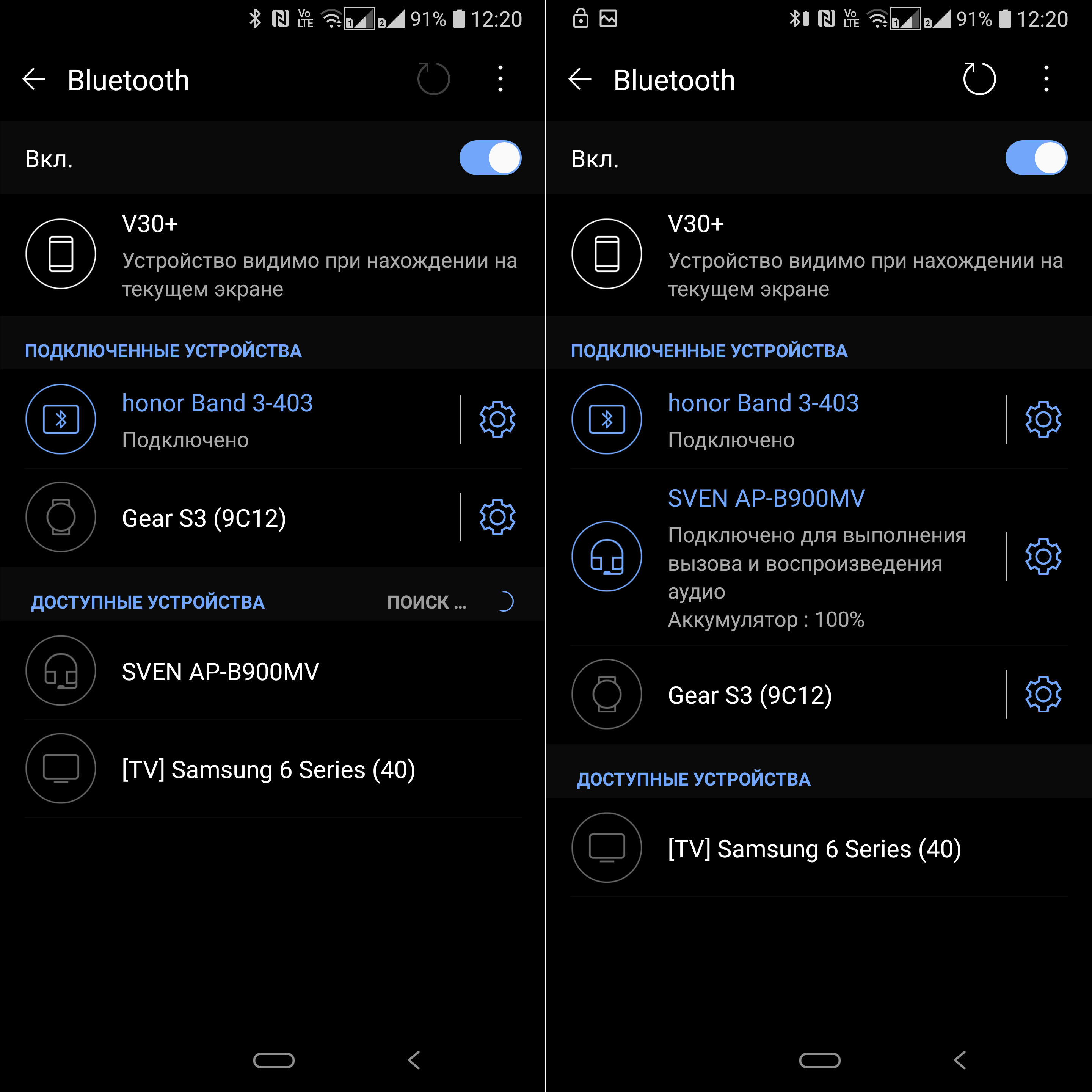 Выбираем наушники в соответствующем меню гаджета, после чего она подключается без ввода пароля. Уровень зарядки аккумулятора корректно транслируется — за ним можно наблюдать в режиме онлайн, если устройство-источник звука поддерживает эту функцию. Обо всех событиях гарнитура сообщает короткими сигналами, голосового оповещения нет.