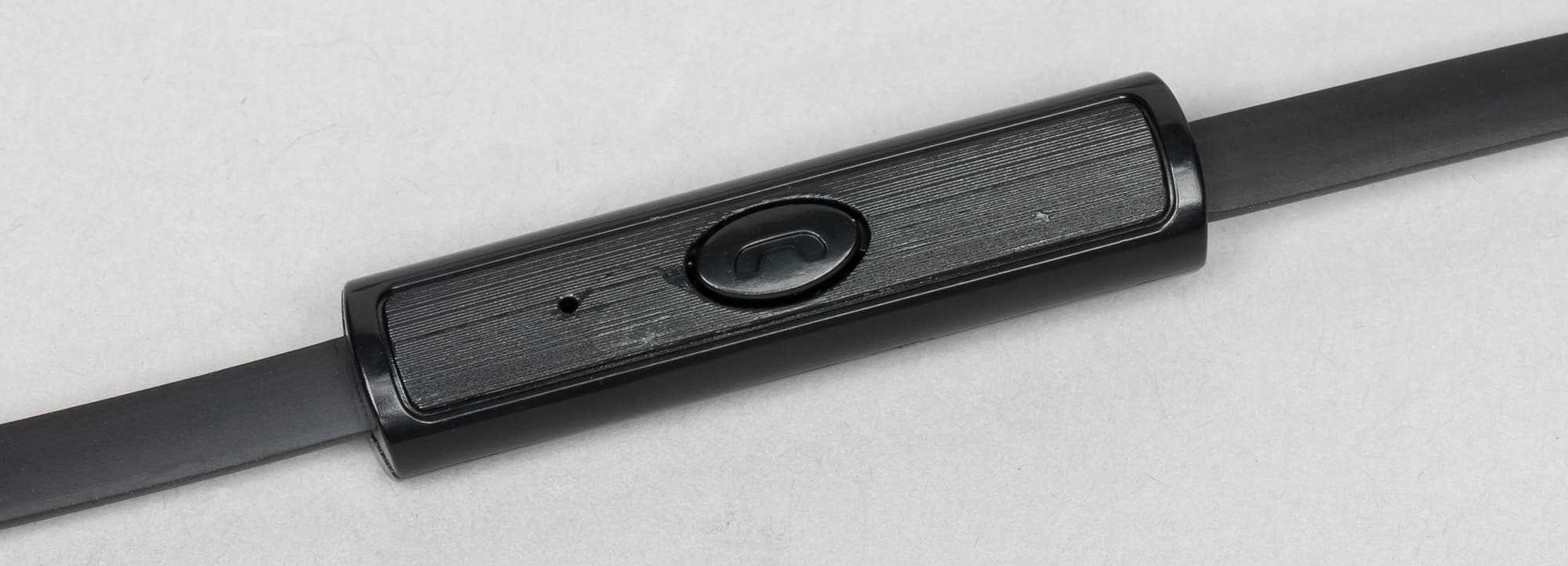 На верхней части кабеля есть небольшой пульт с микрофоном и одной кнопкой, управляющей паузой и ответом на звонок. Клавиши на чашках при проводном подключении не работают, потому нелишними были бы и управление громкостью, переключение треков возможно с помощью многократных нажатий единственной клавиши. Но это в идеале, главное здесь — наличие микрофона. А управлять плеером все равно удобнее с помощью «умных» часов или фитнес-браслета.