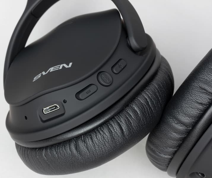 На левой чашке расположены отверстие микрофона, кнопки управления, разъем Micro-USB для зарядки, рядом с ним — небольшой индикатор. Клавиши громкости при длительном нажатии переключают играющие треки, центральная кнопка отвечает за включение гарнитуры, управление паузой и ответ на звонок.