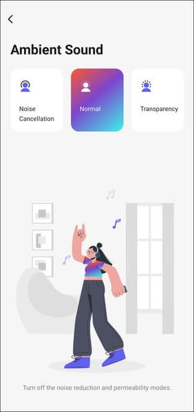 Кнопка воспроизведения, расположенная поверх изображения наушников, здесь не для красоты — она действительно работает. По тапу открывается модуль управления воспроизведением: можно поставить музыку на паузу, переключать треки и изменять громкость. В нижней части экрана находятся несколько кнопок. Первая из них ведет в меню настройки активного шумоподавления и режима звуковой прозрачности, в котором микрофоны гарнитуры транслируют внешние звуки в динамики.