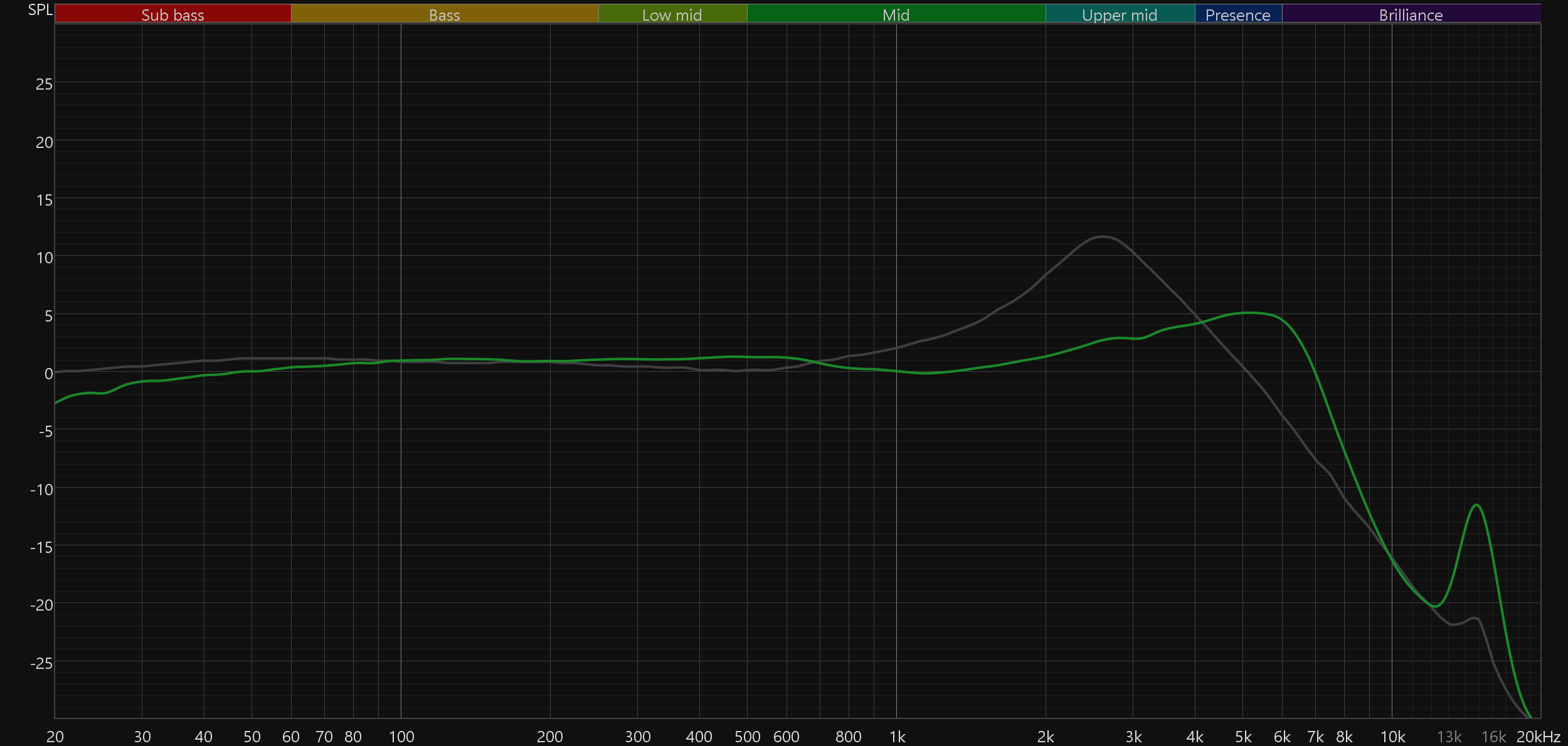 График АЧХ показан на фоне кривой IDF (IEM diffuse field compensation), предоставленной производителем используемого стенда. Ее задача — помочь скомпенсировать резонансные явления в имитированном слуховом канале и особенности оборудования, создав «звуковой профиль», максимально корректно иллюстрирующий то, как звучание наушников воспринимается слушателем. Ее можно рассматривать как адаптированный под конкретное устройство аналог так называемой кривой Хармана, созданной командой Harman International под руководством доктора Шона Олива. Скомпенсируем полученный график АЧХ в соответствии с кривой IDF — в таком виде он наиболее полно иллюстрирует субъективные впечатления от прослушивания.