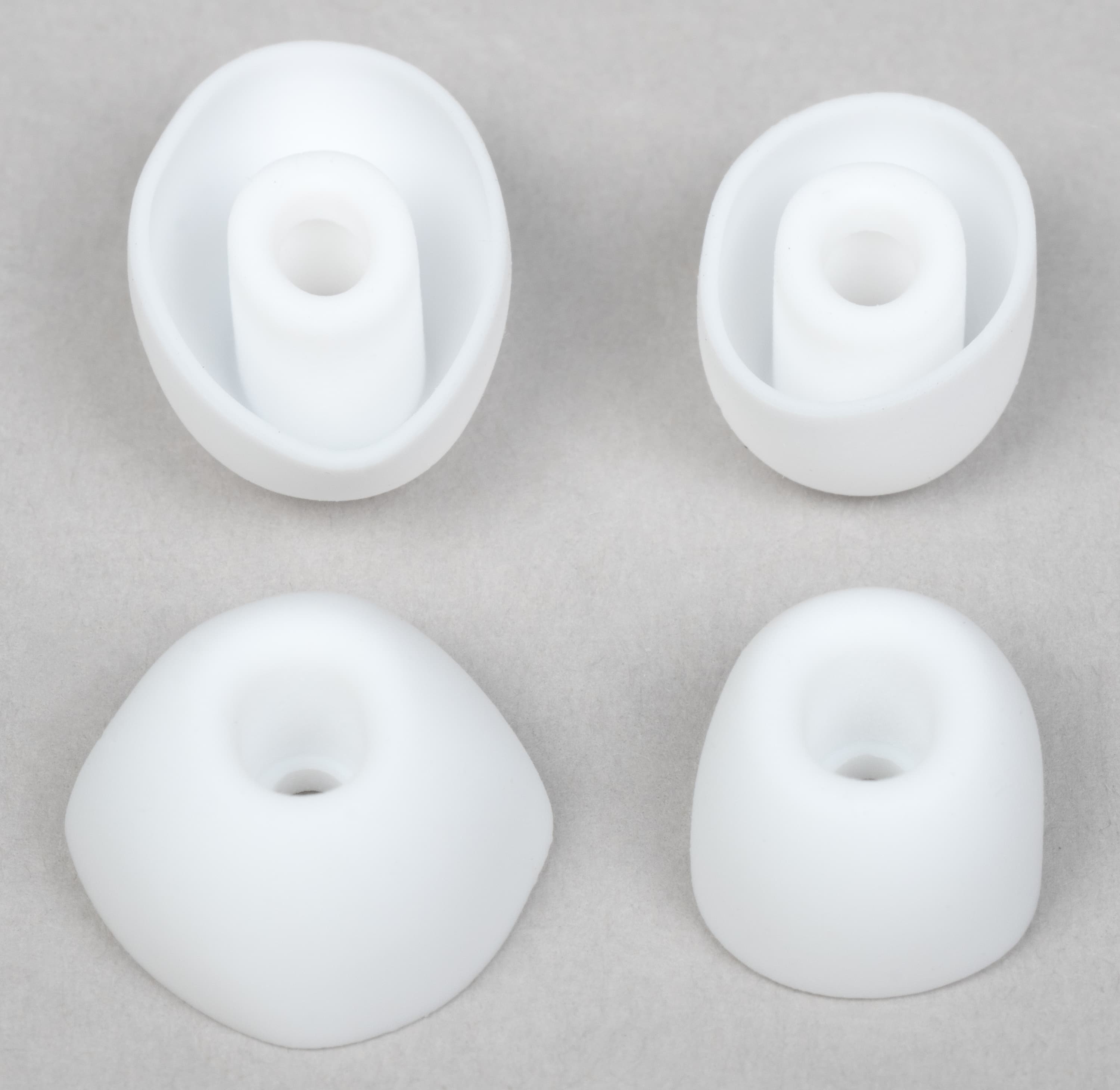 Силиконовые насадки удерживаются за счет крупного выступа по периметру звуковода. Держатся они достаточно надежно, при этом снимаются и надеваются без особых усилий.