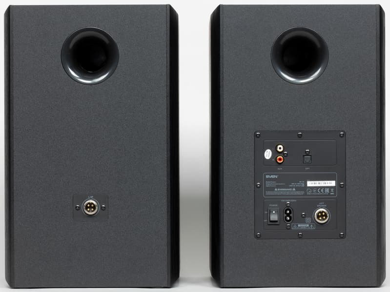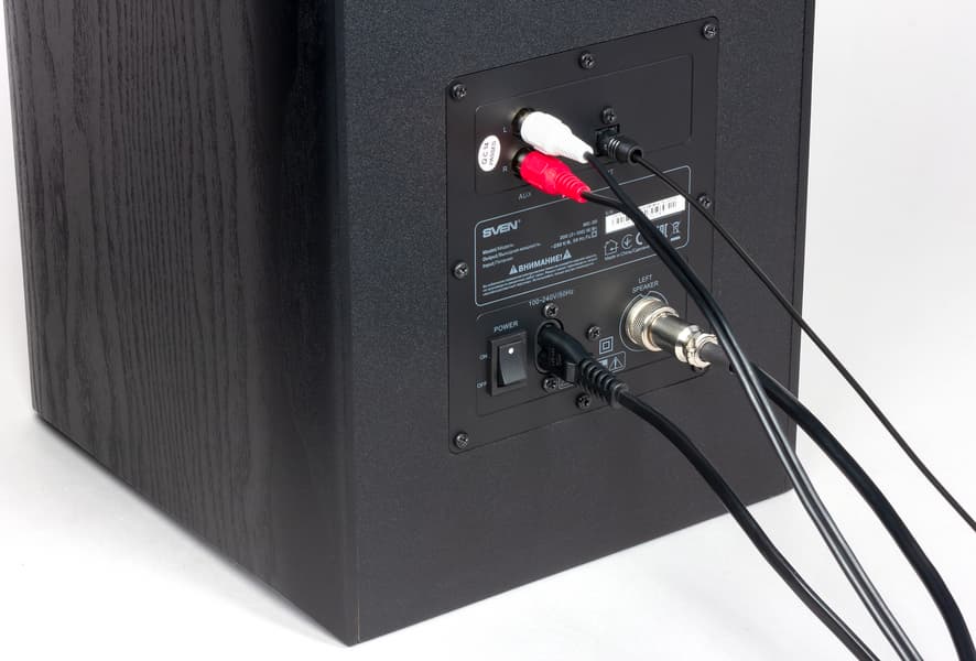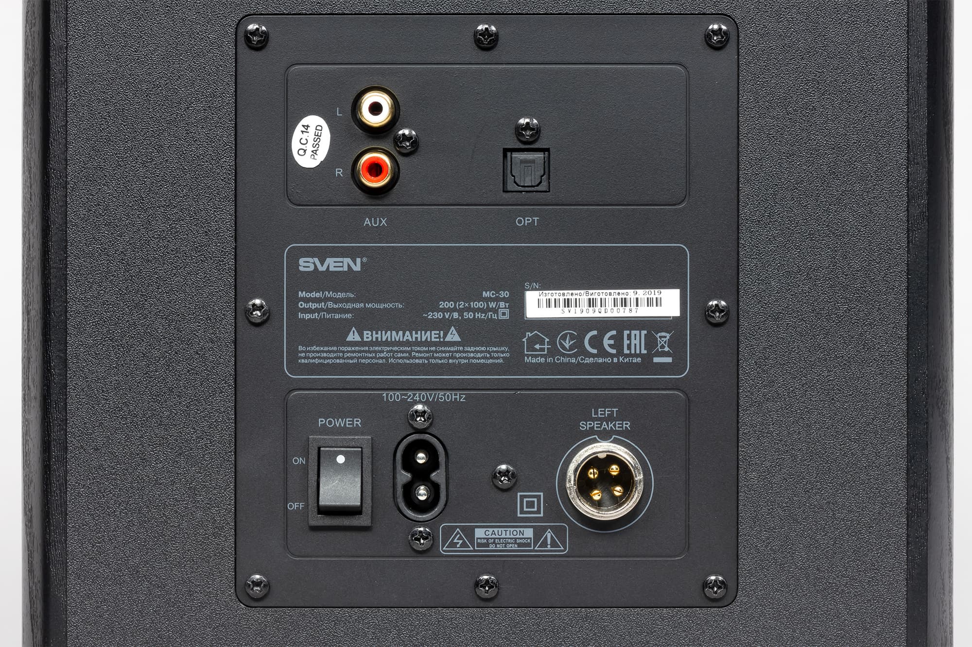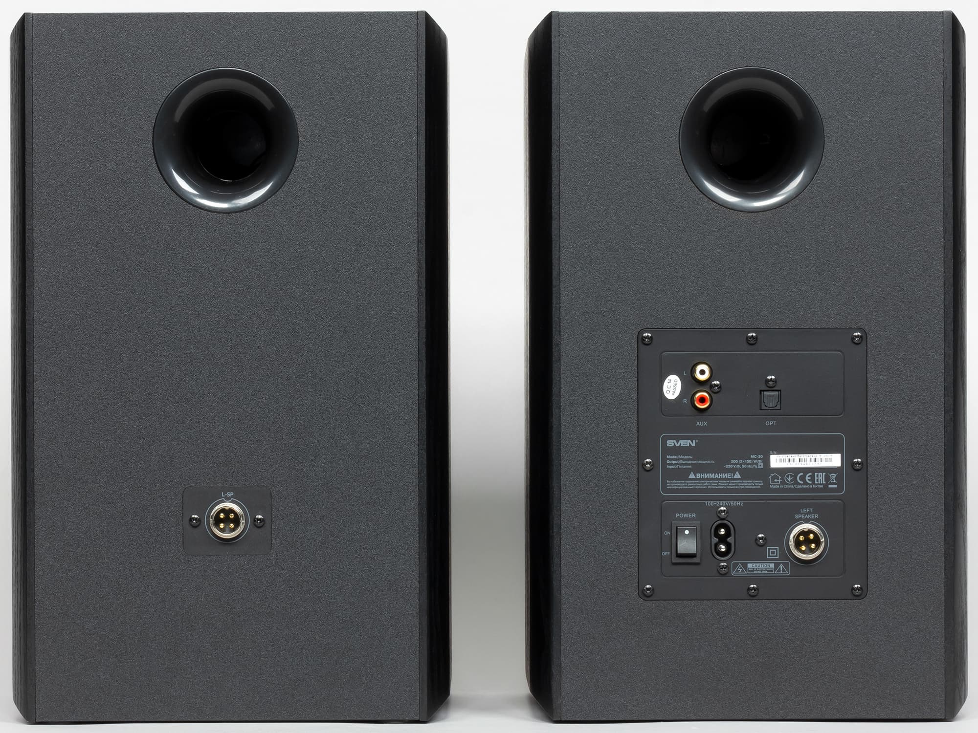 На заднюю поверхность выведены отверстия фазоинверторов. Соответственно, ставить Sven MC-30 близко к стене — плохая затея, это надо иметь в виду. На задней стенке правой колонки расположена панель для подключения. Левая же имеет только разъем для соединения с активной «коллегой».
