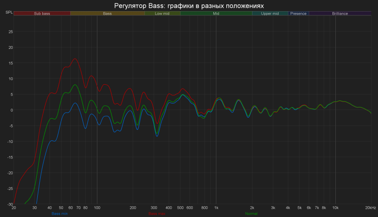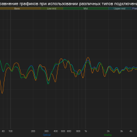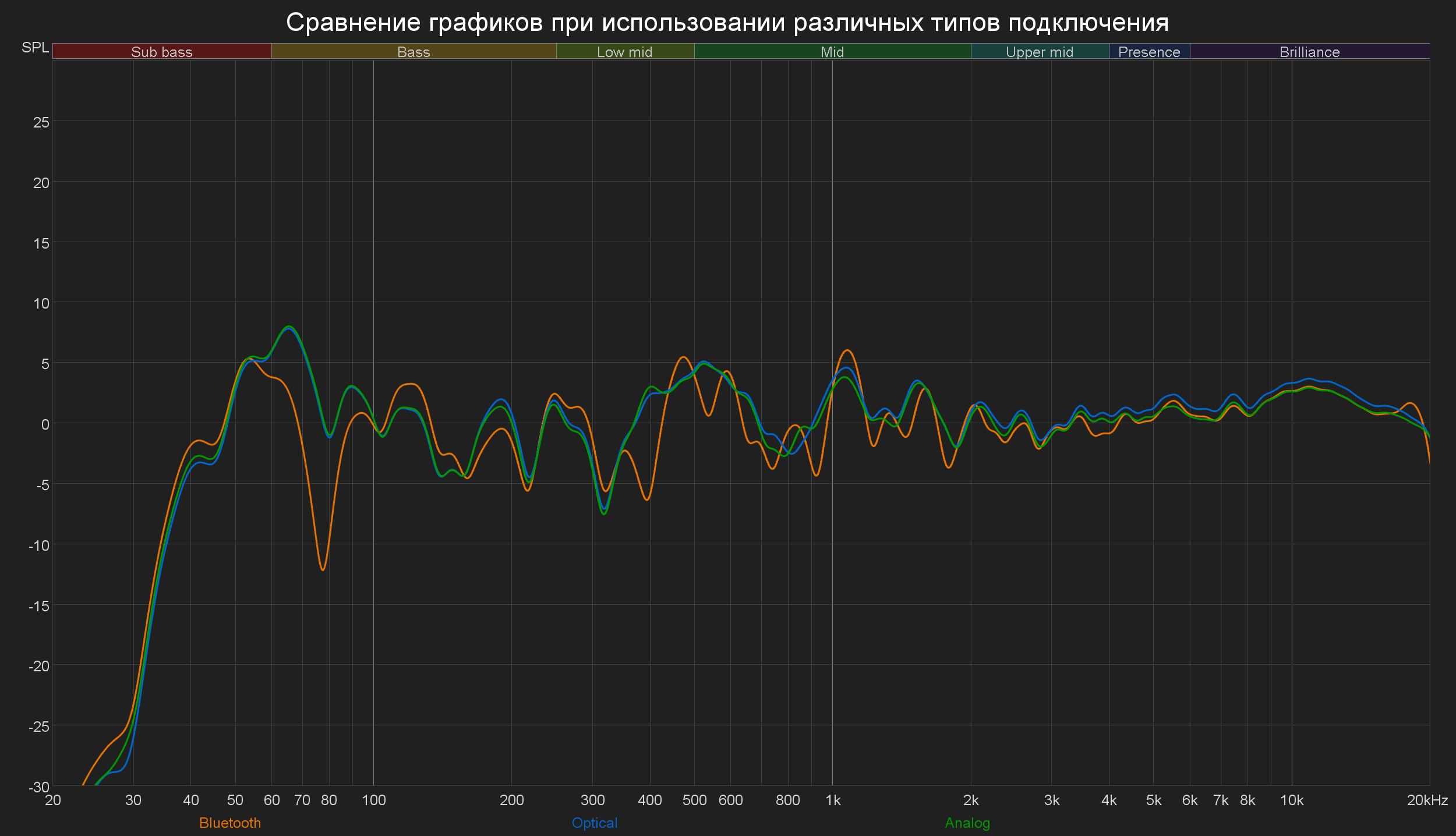 Далее сравним графики при различных типах подключения. При использовании оптического и аналогового входа они практически совпадают, а вот при передаче сигнала через Bluetooth есть ряд заметных отличий. Особенно обращает на себя внимание, конечно, провал в области 70 Гц.
