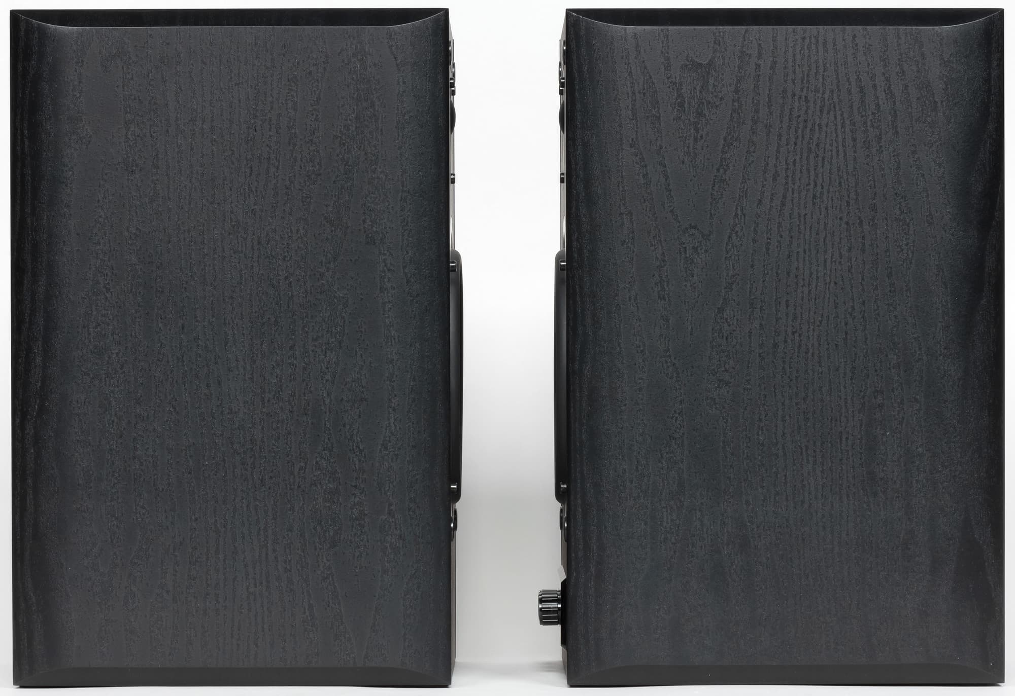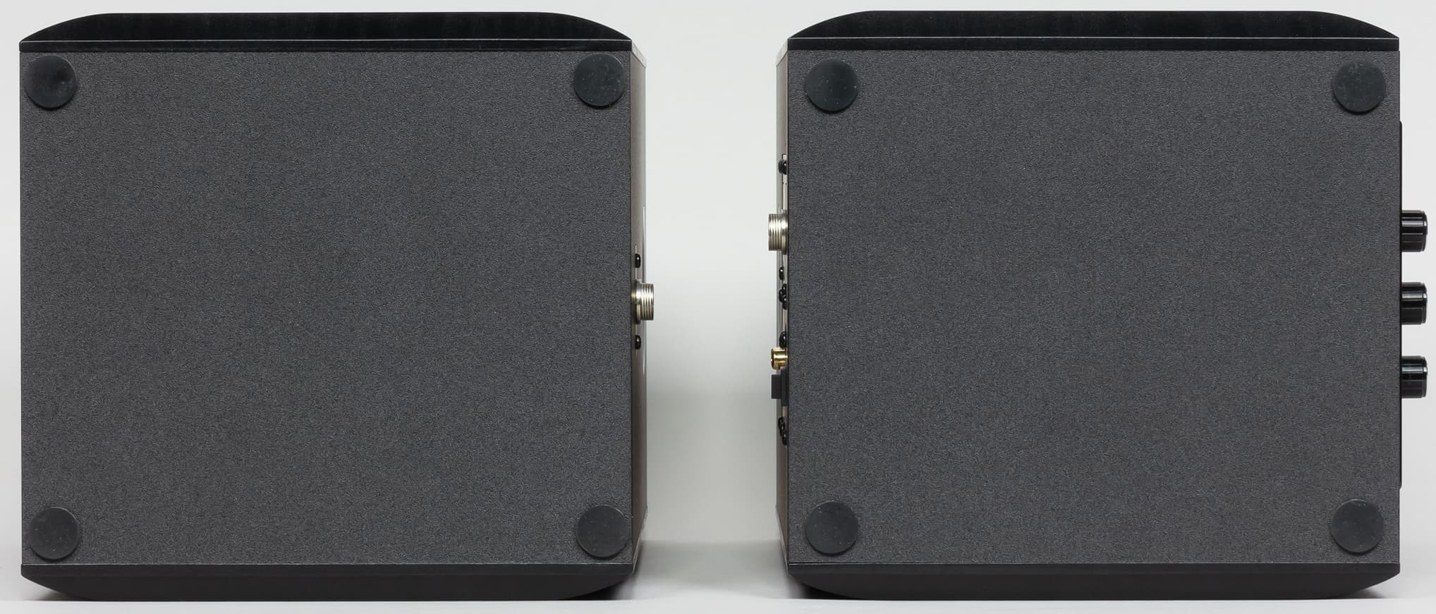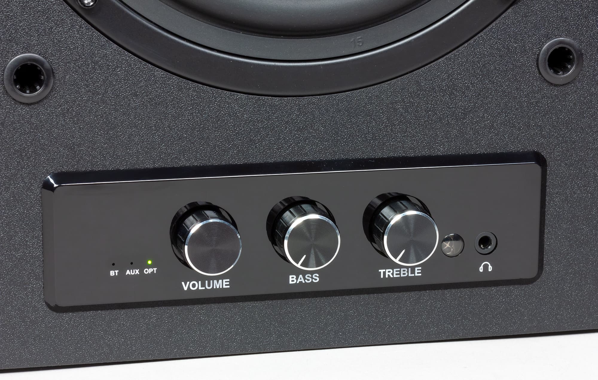 На передней панели правого монитора находится регулятор громкости — валкодер с дискретным ходом без ограничений по углу вращения, также служащий для активации режима ожидания (длительное нажатие) и переключения входов (короткое нажатие). Рядом расположены два регулятора тембра с плавным вращением и фиксацией в крайних положениях, а также разъем 3,5 мм для подключения наушников и ИК-порт для пульта дистанционного управления. Слева от регуляторов размещены индикаторы задействованного входа. Поверхность панели глянцевая и не очень устойчивая к появлению отпечатков — придется стараться не прикасаться к ней лишний раз.