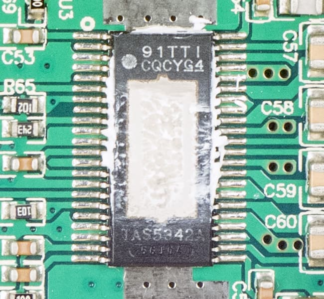 В качестве усилителей мощности используется пара микросхем TAS5342A, каждая из которых содержит четыре усилителя класса D, в мостовом включении способных обеспечить воспроизведение стереозвука с выходной мощностью до 2х100 Вт на нагрузке 4 Ом (или до 2х80 Вт на 6 Ом, до 2х65 Вт на 8 Ом). Естественно, для биампинга как раз и требуется две таких ИМС.