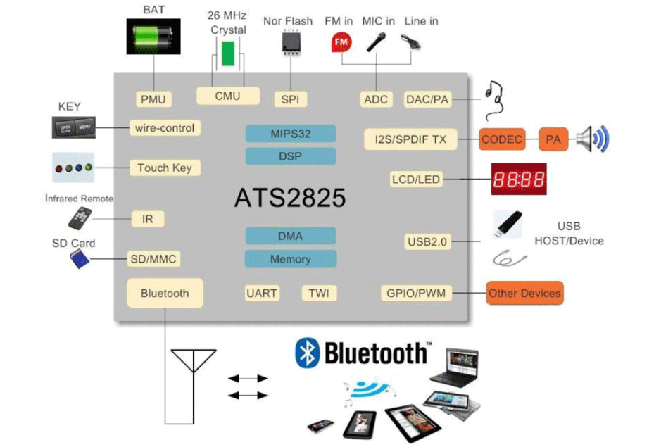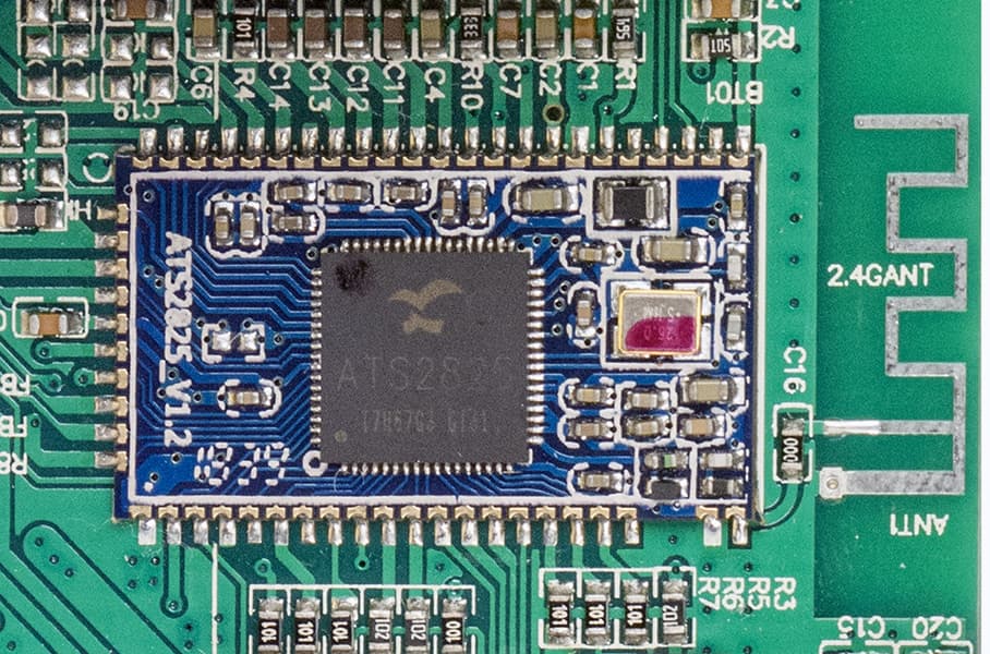 На этой же плате установлен модуль Bluetooth на ИМС ATS2825 с антенной, выполненной в виде печатного проводника.