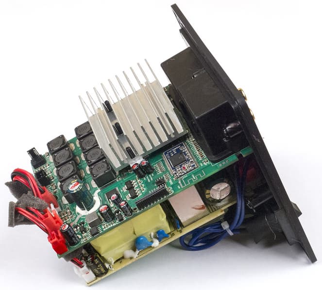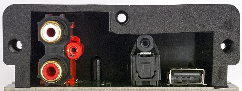 Как видите, у него есть и функции, не реализованные в данной конструкции, включая поддержку USB-устройств. Интересно, что на плате усилителя имеется и разъём USB-A female, однако он не задействован ни «логически» — его нельзя выбрать в качестве входа и управлять воспроизведением аудиофайлов с флешки (что потребовало бы наличия соответствующего индикатора, изменения органов управления, пульта ДУ, то есть заметного повышения цены), ни физически — на съёмной задней панели нет прорези для него, порт становится виден только после снятия платы.