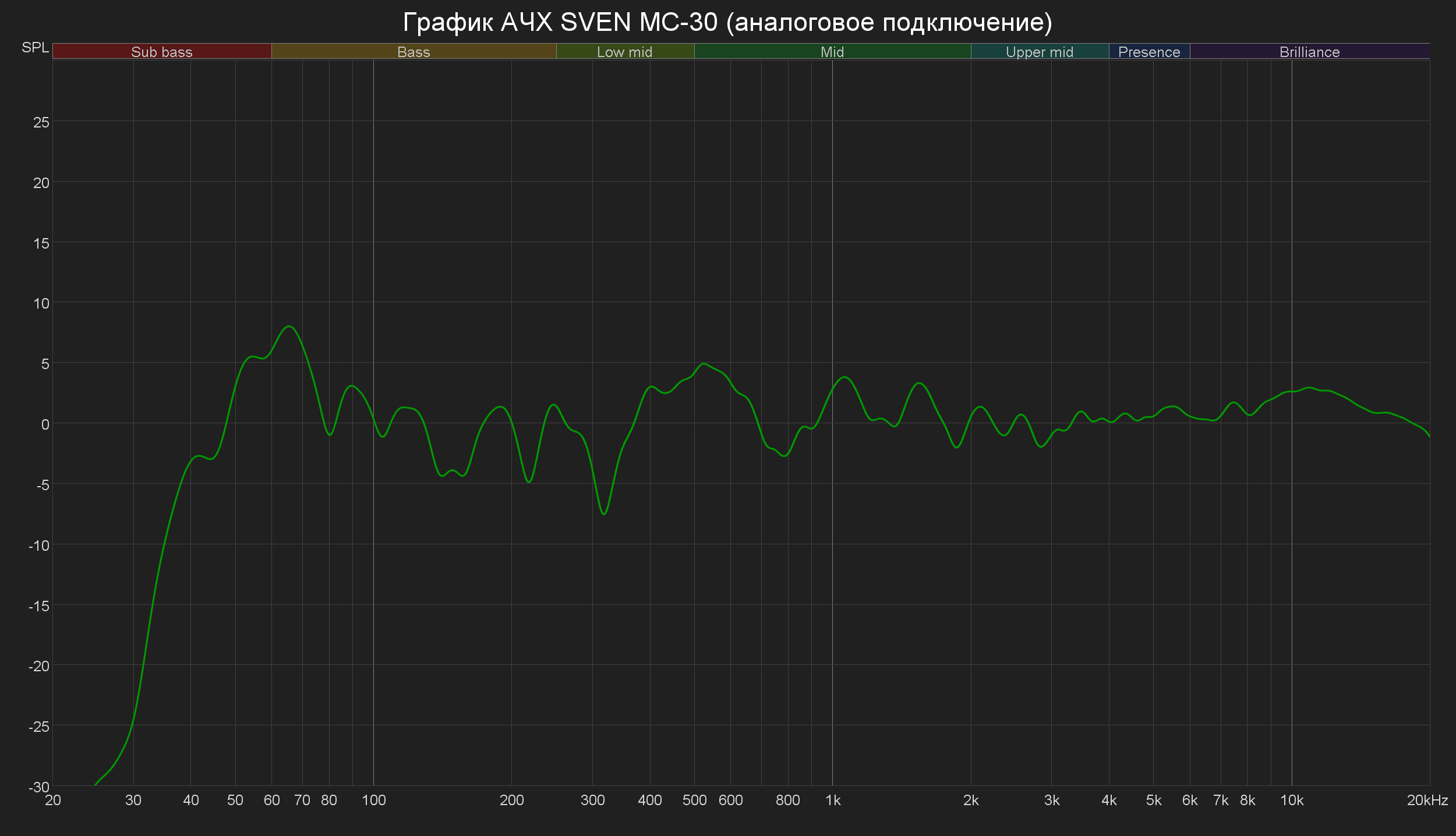 Несмотря на сравнительно скромные размеры, Sven MC-30 выдает объемный и глубокий бас, который при этом не мешает восприятию довольно детальной середины. При беспроводном подключении все не так радужно: бас невнятный, пропадает детальность в средних частотах. Но это было вполне предсказуемо — как уже упоминалось выше, Bluetooth-соединение рассчитано на подкасты, аудиокниги и фоновую музыку, не более того. Посмотрим на график АЧХ колонок при проводном подключении через аналоговый вход. Измерения традиционно производились при расположении микрофона по нормали к колонке на расстоянии 60 см.