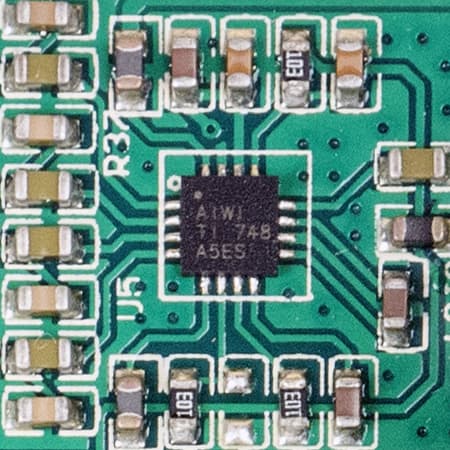 Ещё один крошечный чип TPS748 — это линейный стабилизатор с малым падением напряжения вход/выход.
