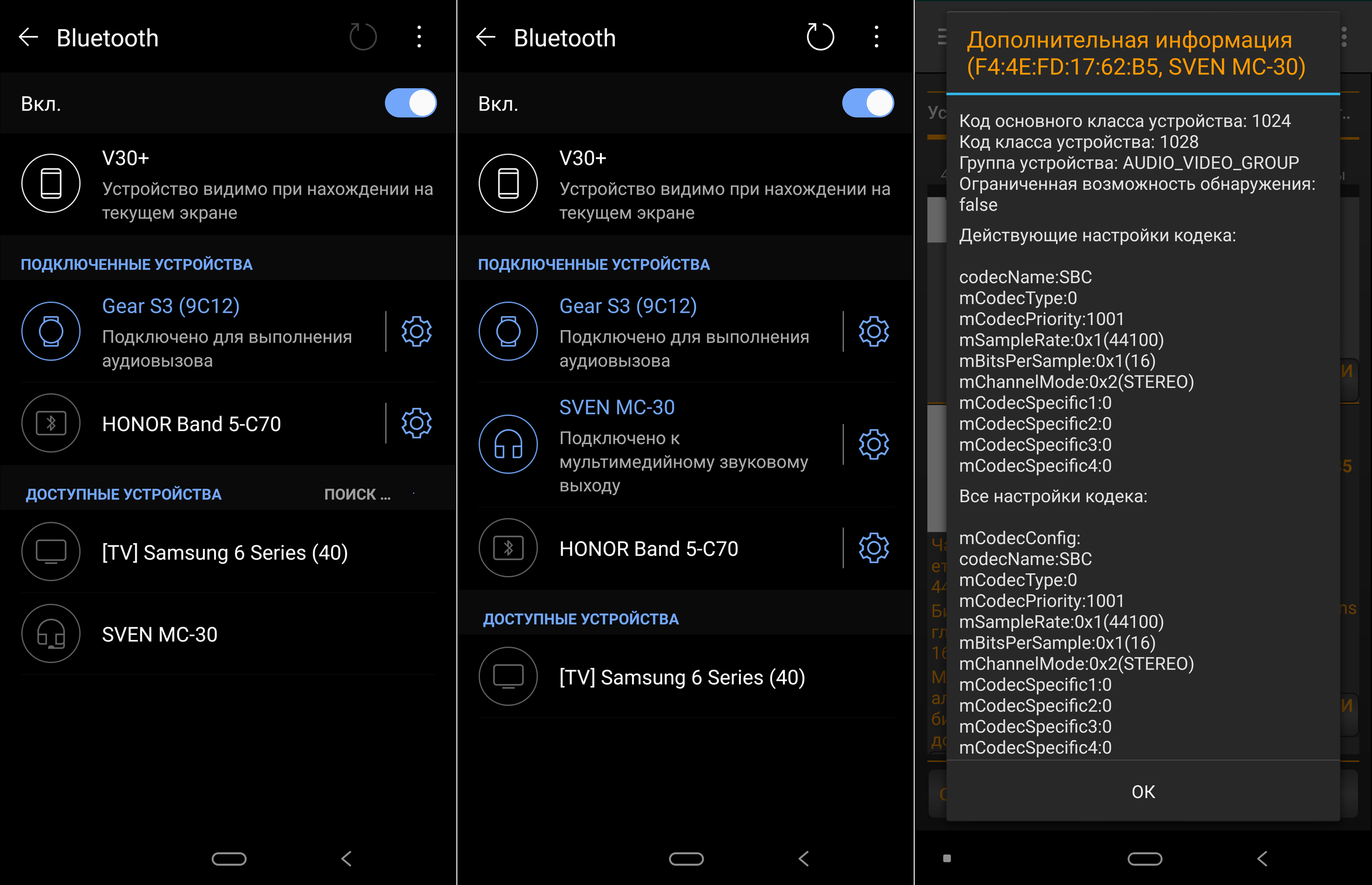 Подключение происходит стандартным образом: находим акустику в соответствующем меню гаджета, нажимаем, соединяемся без ввода пароля. Заодно с помощью Bluetooth Scanner проверяем, какой кодек используется. Поддерживается только SBC, что вполне понятно и разумно. Для того чтобы запустить подкаст или фоновую музыку с телефона, его достаточно, а для обеспечения качественного звука существует два варианта проводного подключения.