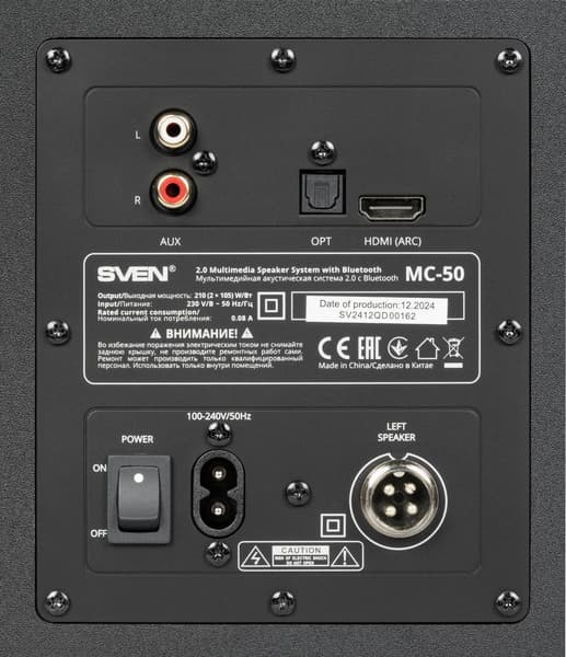 Отверстие фазоинвертора выведено на переднюю панель, что обеспечивает Sven MC-50 акцентированный бас, а заодно позволяет без опасений размещать колонки практически вплотную к стенам.