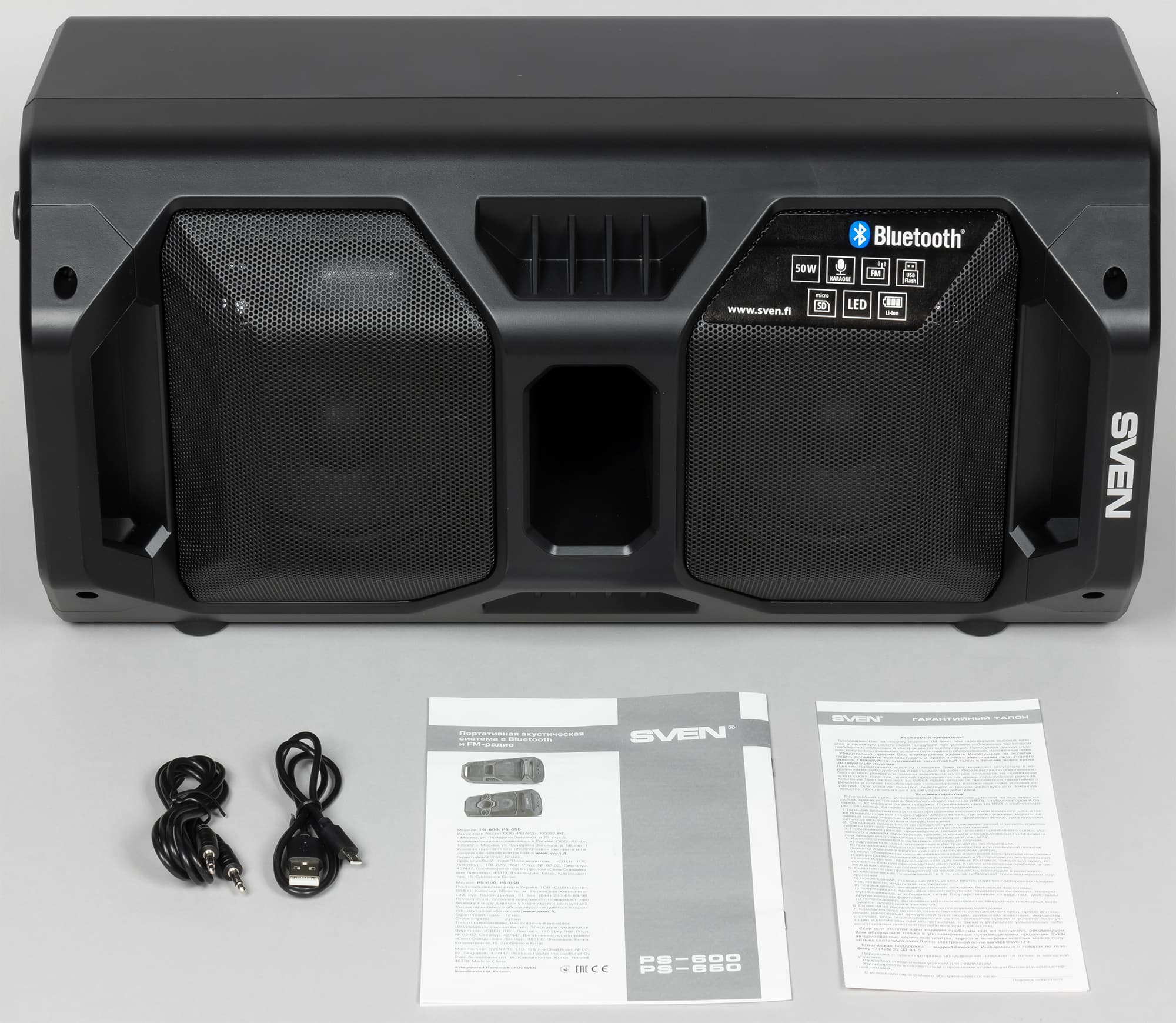 С автономностью у Sven PS-600 все замечательно — два аккумулятора по 4000 мА·ч каждый делают свое дело. При подключении по Bluetooth, на среднем уровне громкости и при включенной подсветке колонка проработала порядка 17 часов, что впечатляет. Зарядка от 0 до 100%, правда, тоже требует времени — у нас на это ушло почти 6 часов. Но в итоге можно смело говорить, что полный день колонка работает, а за ночь успевает зарядиться.