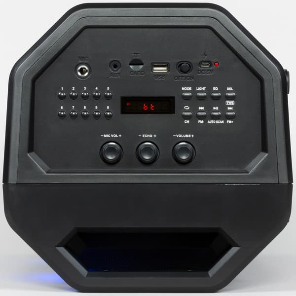 Встроенный эквалайзер позволяет регулировать только уровень низких и высоких частот. Можно подчеркнуть средние, просто отказавшись от «долбящего» баса и немножко подрезав высокие. Но тут дело вкуса, конечно. В любом случае, для автономного устройства с пластиковым корпусом и далеко не запредельным весом звучит Sven PS-600 достаточно хорошо. Для ее сферы использования — вечеринок с друзьями, отдыха за городом и пения караоке качества звучания точно хватит, а некоторые его особенности могут быть вполне «в кассу».