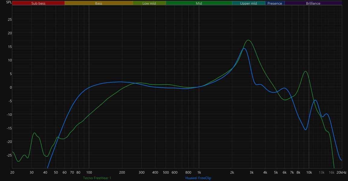 Сравним звучание Tecno FreeHear 1 с уже знакомыми нам более дорогими наушниками-каффами. Хорошо заметно, что с ростом цены значительно расширяются и возможности гарнитур в воспроизведении баса.