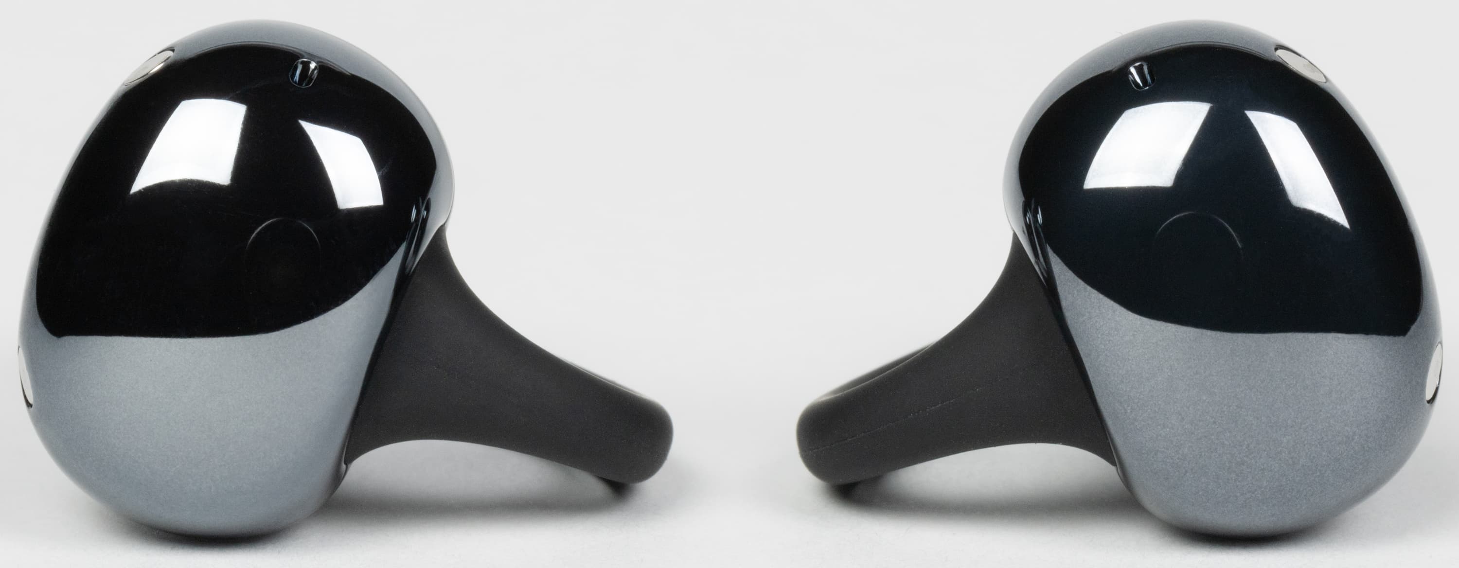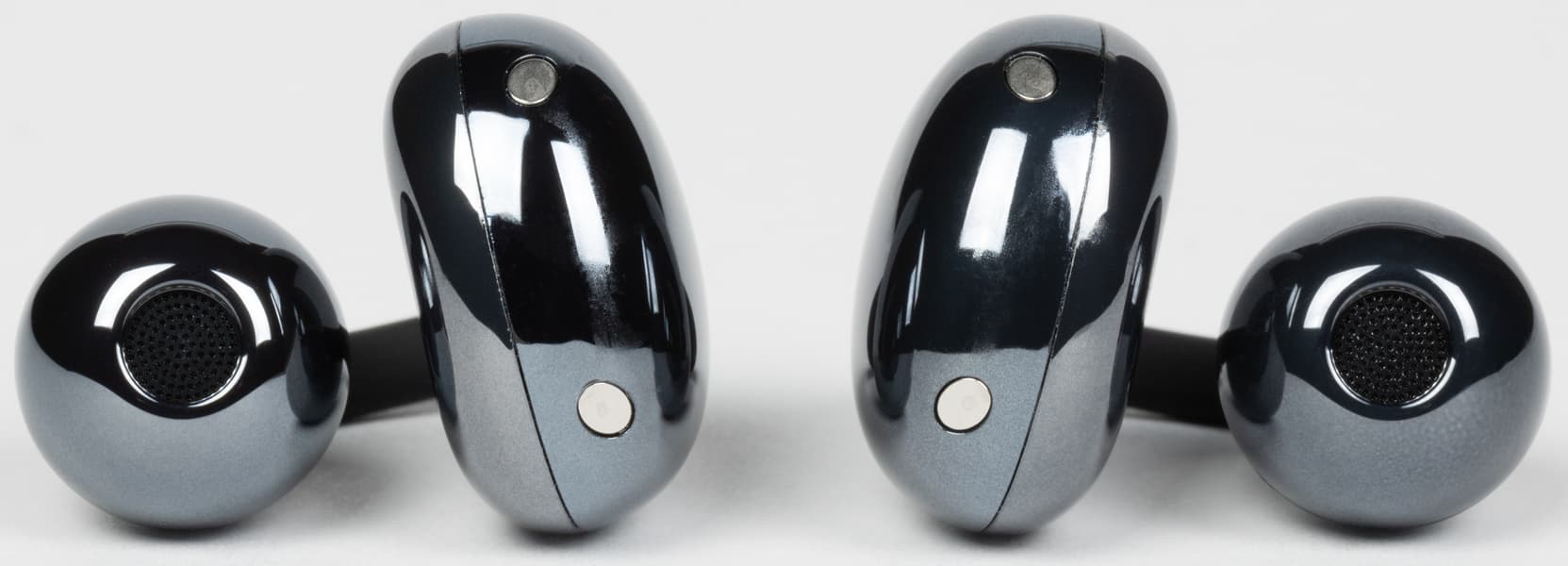 На внешней стороне округлых элементов расположены отверстия микрофонов — они отвечают как за передачу голоса, так и за работу системы шумоподавления во время звонков. Отдельно стоит отметить, что несмотря на наличие нескольких довольно крупных отверстий в корпусе, наушники имеют заявленную степень влагозащиты IPX4.