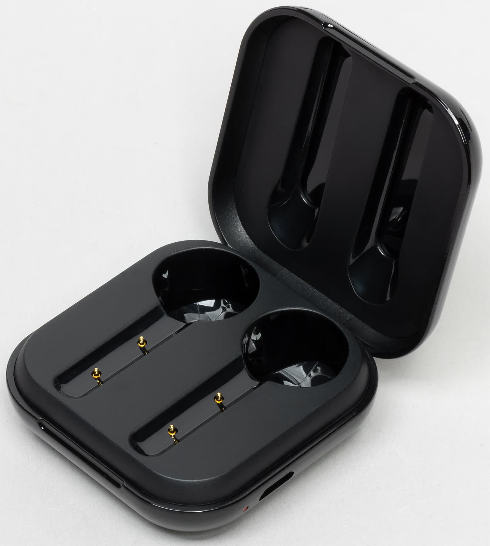 Крышка плотно удерживается магнитным креплением, открывается и закрывается без клика, с приятным небольшим усилием. Внешняя часть слотов для наушников матовая, внутри них расположены контакты для зарядки. Сбоку можно заметить разъем Micro-USB. За отсутствие USB-C бюджетные модели мы пока не критикуем, но вот еще немного — и начнем.