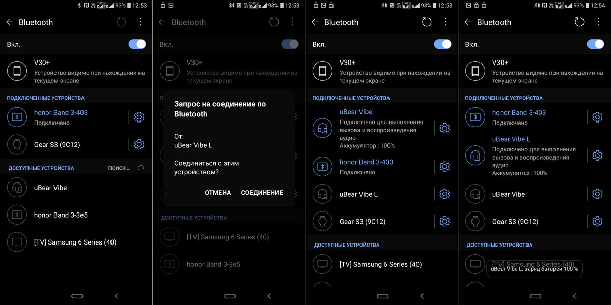 При первом извлечении из кейса наушники автоматически подключаются к уже «знакомому» устройству либо становятся доступны для подключения. Также режим сопряжения можно активировать нажатием обоих сенсоров на две секунды. Далее находим устройство uBear Vibe в соответствующем меню гаджета и подключаем. Все просто, но есть интересная особенность. Правый наушник по умолчанию является ведущим, к нему и происходит первоначальное подключение.