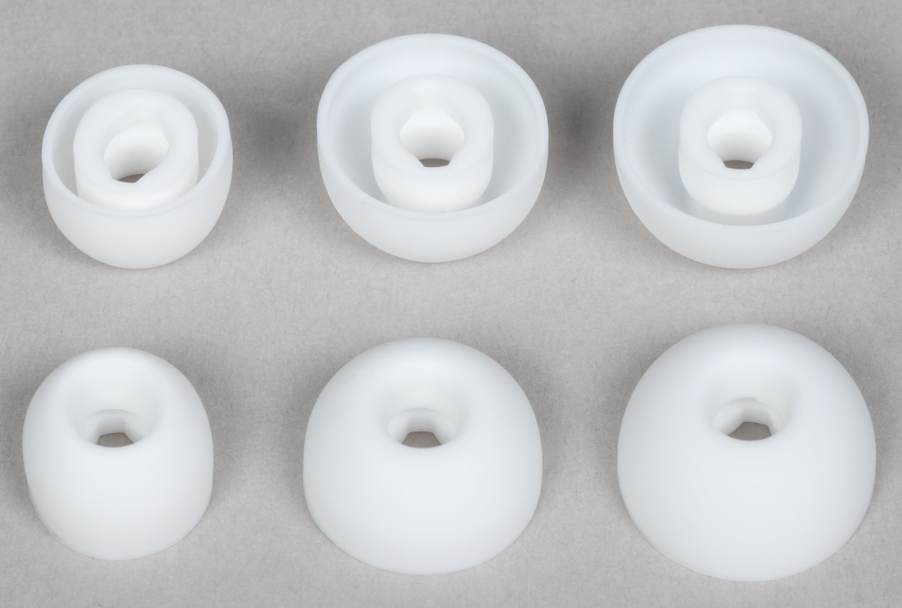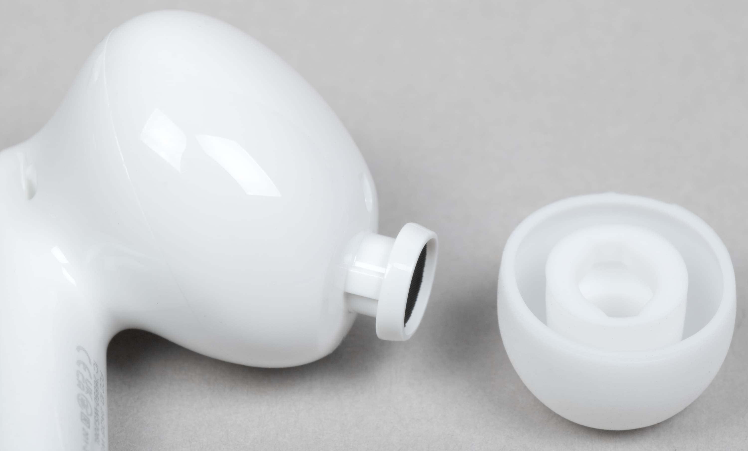 Силиконовые насадки удерживаются с помощью крупных выступов на концах звуководов. Держатся они надежно, снимаются сравнительно просто. А вот поставить их обратно бывает сложновато — хорошо, что регулярно это делать необходимости нет.