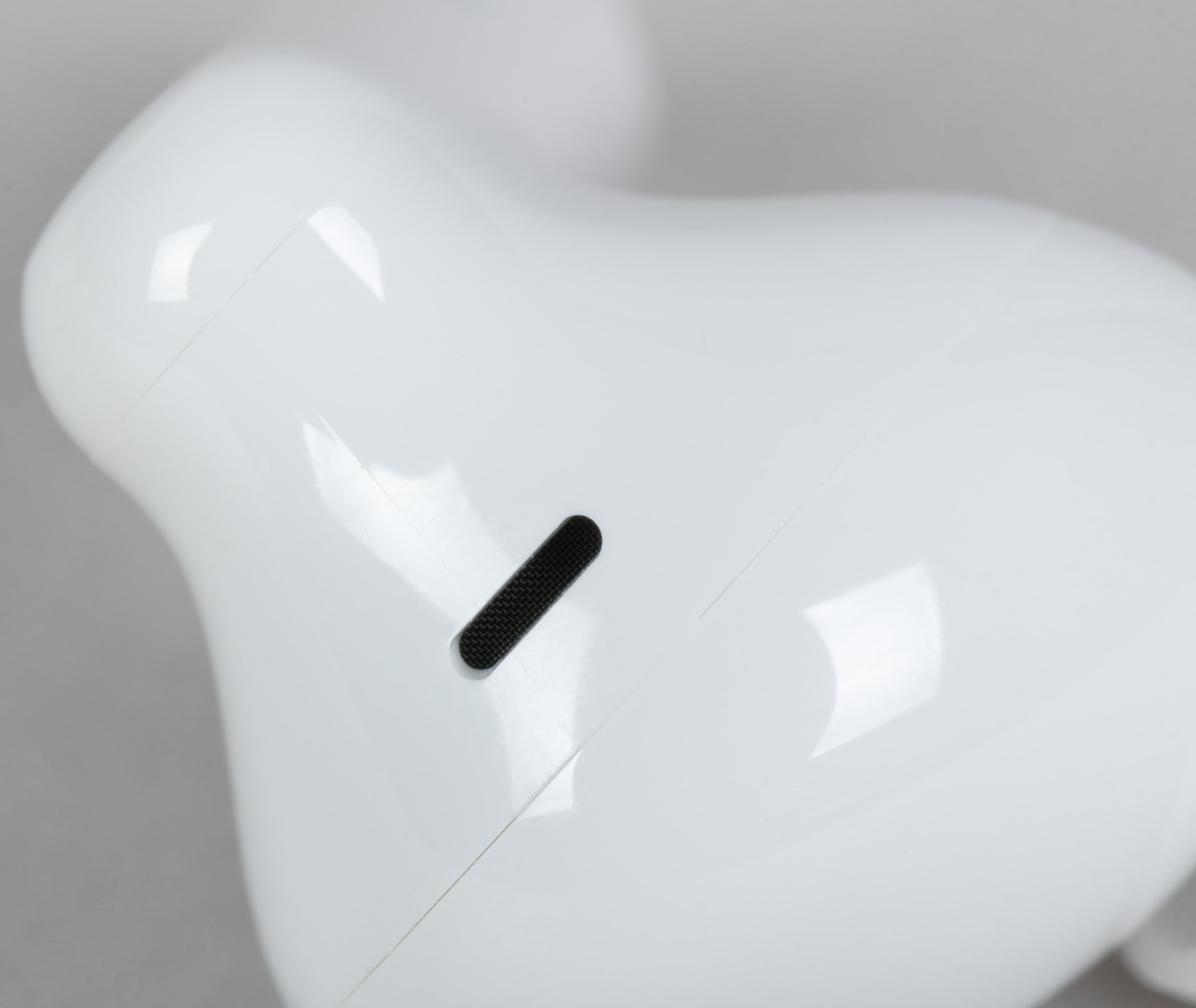 Щелевидное отверстие микрофона системы активного шумоподавления расположено на верхней поверхности округлой части корпуса наушников.