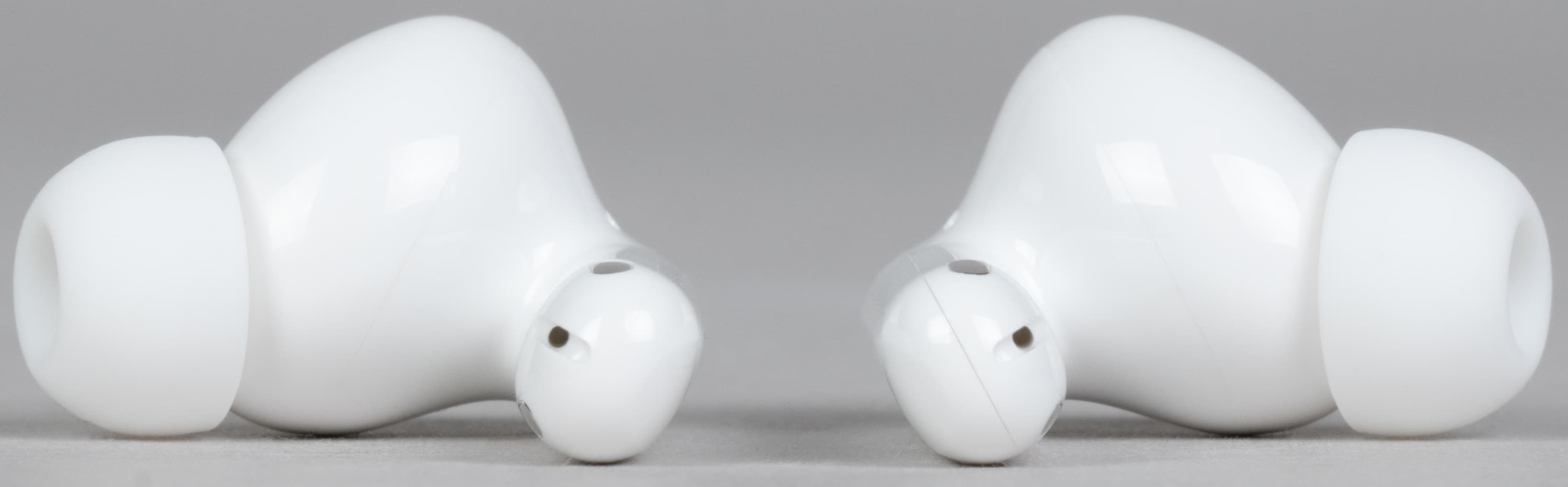 На торце ножек расположены контакты для зарядки, а также отверстия микрофонов для голосовой связи. Если приглядеться, там же можно заметить обозначения «правый»/«левый», но проще ориентироваться по форме наушников и их размещению внутри кейса.